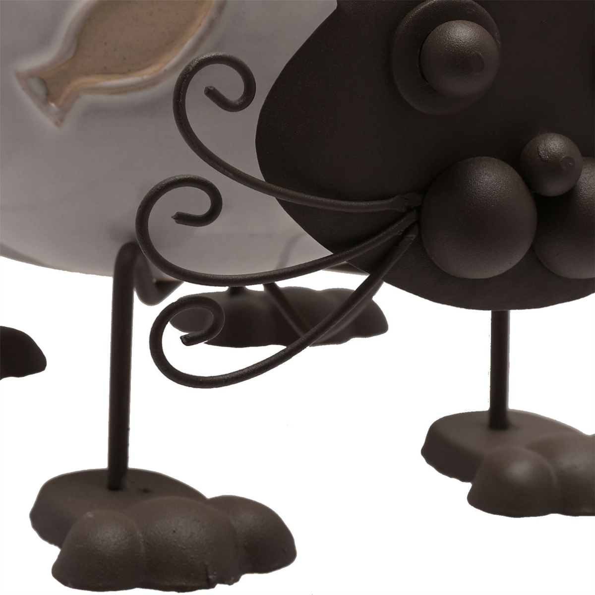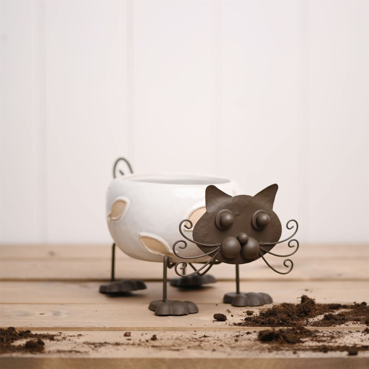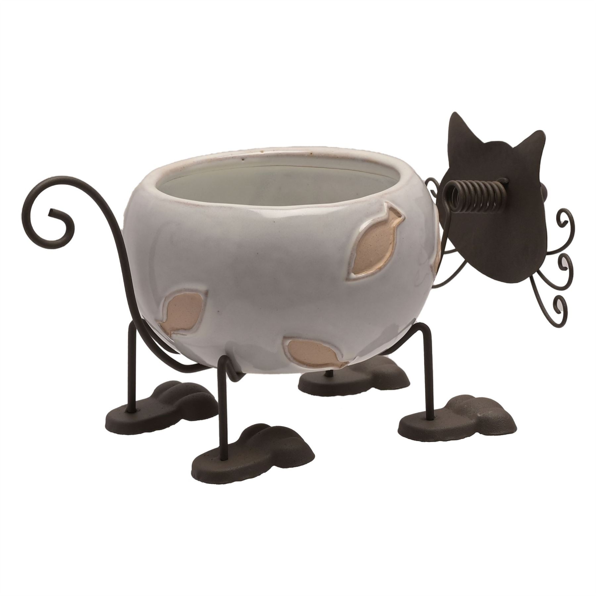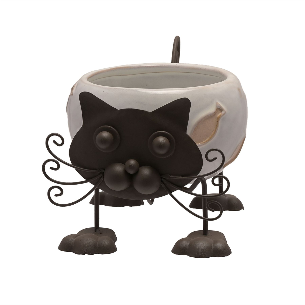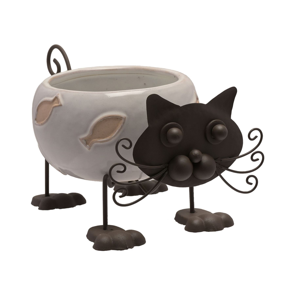 The ceramic planter showcases an adorable cat design, complete with white gloss finish. It is completed by black metal body parts and textured fish decorations.