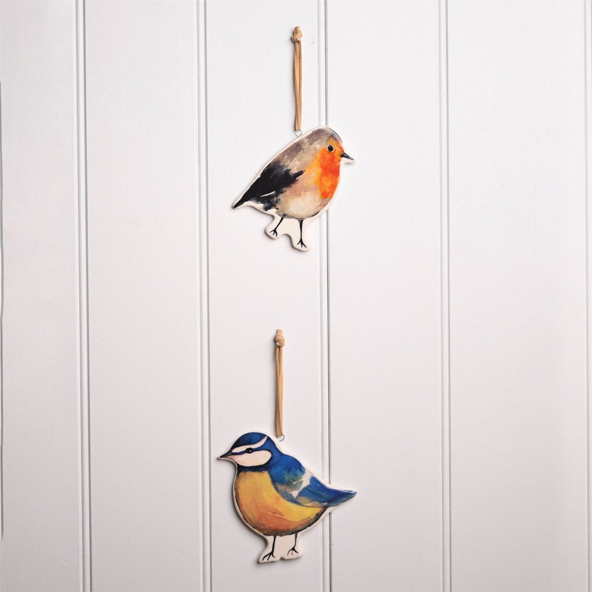 A set of 2 robin and blue tit bird plaques by COUNTRY LIVING�. These gorgeous hanging plaques celebrate wildlife and the wonderful colours of nature. The ceramic plaques showcase a gloss finish, complete with respective bird designs: one robin and one blue tit. They are designed to be displayed using the attached suede hangers. The plaques are packaged in a brown box multi.
