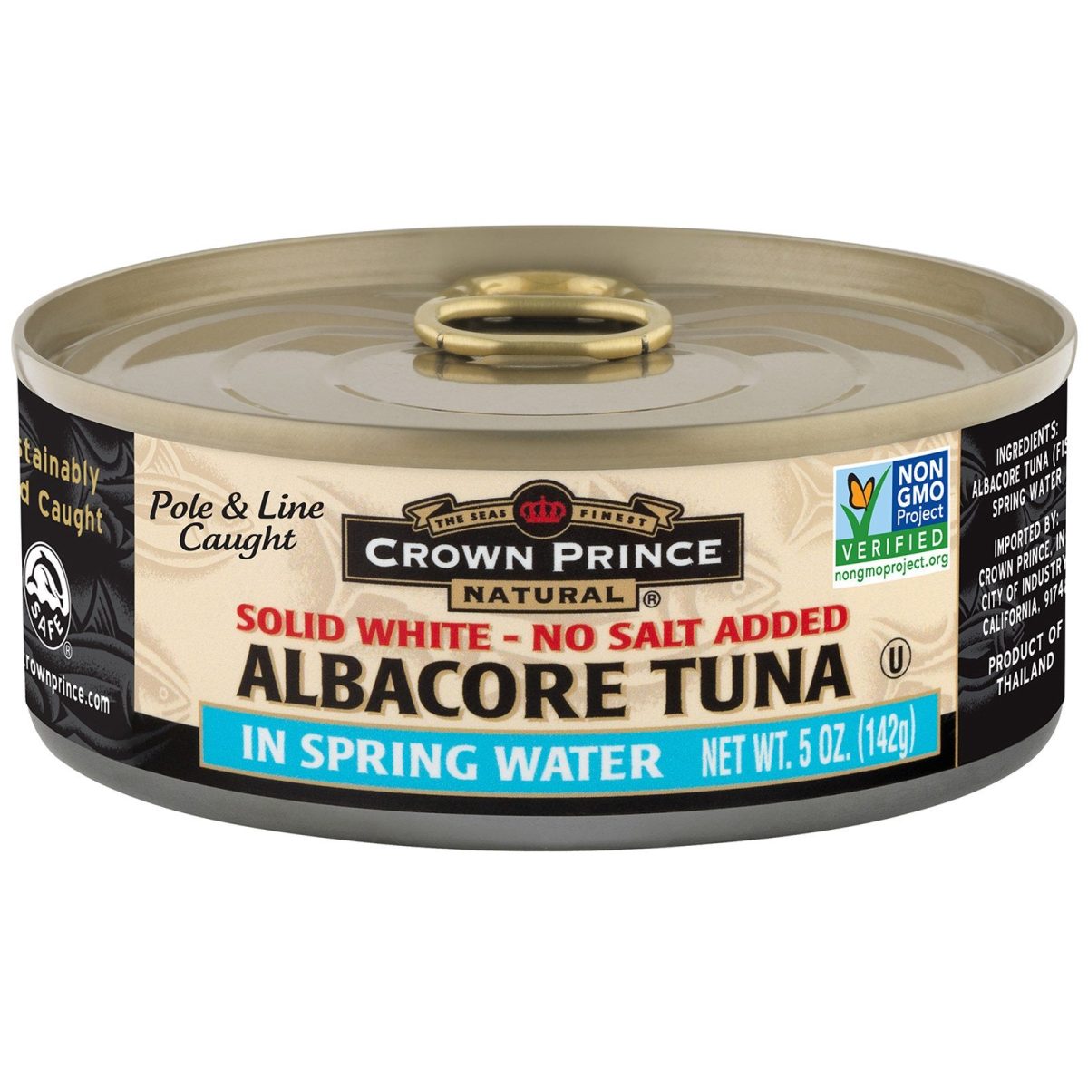 Sustainably Wild Caught Dolphin Safe Pole & Line Caught Non GMO Project Verified Product of Thailand Solid White Albacore Tuna is considered the highest quality tuna available in a can. The meat is light in color and firm in texture without a lot of sediment. One serving of Albacore Tuna provides about one-third of the daily needed protein with very little fat. Our larger sized cans are perfect for feeding the whole family a low-fat, nutritious meal and are available with or without added salt. Try some in your next casserole, salad or sandwich.