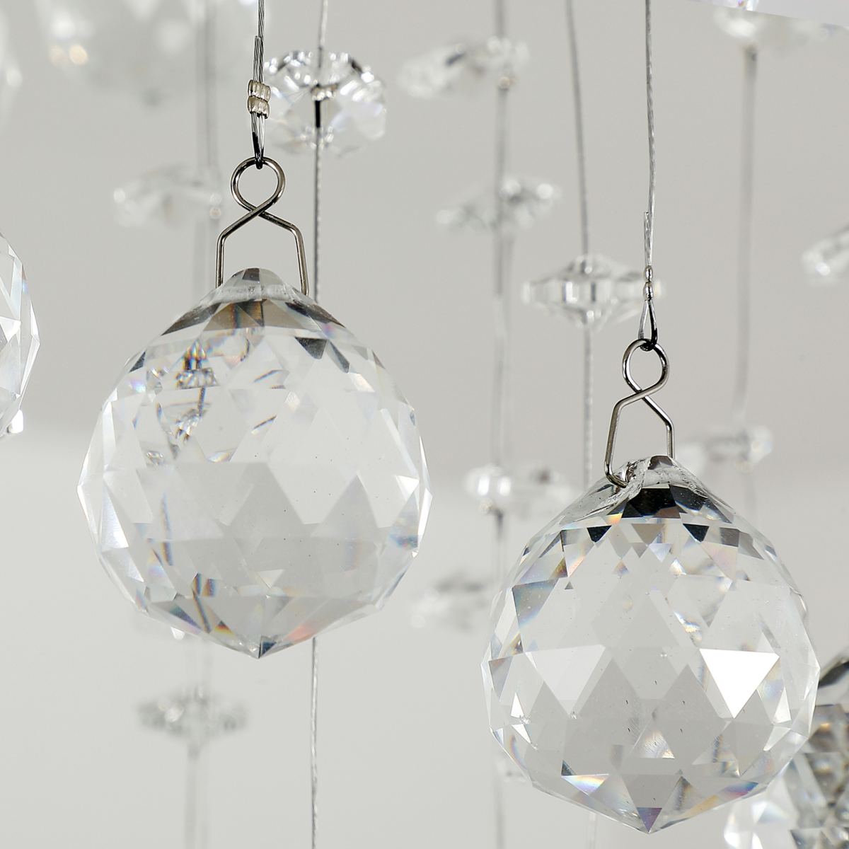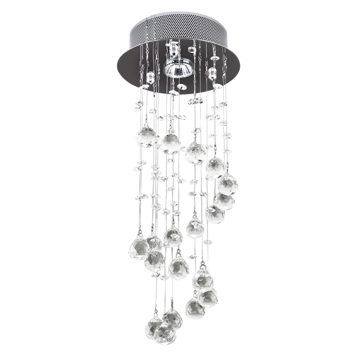 - "Crystal Chandelier, Spiral Rain Drop - Silver/Crystal" - Description: - Exquisite Spiral rain drop design, sparkles from every angle - Made from metal and crystal, fabulous and exquisite - 20 pcs high quality k9 crystal glass ball droplets - GU10 shade 1 x 50w Bulb is Required (Not Supplied) - Ideal for Living Room, Hallway, Stairway, Home office and more - Add classic atmosphere to home decor, elegant light fixture designed to dazzle your home with beauty.