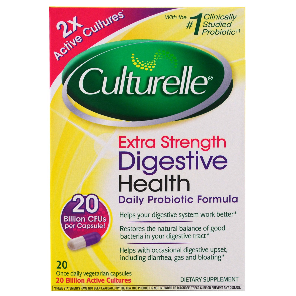 2x Active Cultures With the #1 Clinically Studied Probiotic††Helps your Digestive System Work Better Restores the Natural Balance of Good Bacteria in Your Digestive Tract Helps With Occasional Digestive Upset, Including Diarrhea, Gas and Bloating 20 Billion CFUs per Capsule! Dietary Supplement #1 World's Most Researched Probiotic When the natural balance of good and non-beneficial bacteria in your digestive tract is disturbed, your digestive health is open to a host of potential concerns. Culturelle, with the most clinically studied probiotic, ††Lactobacillus GG, and inulin, a known prebiotic, naturally promotes a healthy balance in your digestive tract. Take Culturelle daily to: Help boost digestion and overall digestive health Help reduce the likelihood of gas and bloating Helps support the immune system and general well-being Help minimize travel-associated stomach and digestive issues Culturelle is safe for everyday, long-term use. Guarantee of Purity & Potency The Lactobacillus GG strain (Lactobacillus rhamnosus GG - ATCC 53103) was discovered in 1985 at Tufts University in Boston, MA. Considered the premier probiotic in the world, Lactobacillus GG has been the subject of over 1000 scientific studies. Culturelle is the only dietary supplement brand with 100% Lactobacillus GG. We certify that our products meet the highest standards of purity and potency. Unlike some products which measure the number of probiotic cultures at time of manufacture, Culturelle guarantees the stated number of live naturally sourced Lactobacillus GG cultures through the expiration date on the package.*** Culturelle It's #1 for a Reason.‡ ‡Nielsen xAOC 52 weeks unit/dollar sales ending 1/23/16. ***Guaranteed potency through date on box when stored according to instructions below. ††Based on the number of Lactobacillus GG clinical studies, as of May 2015