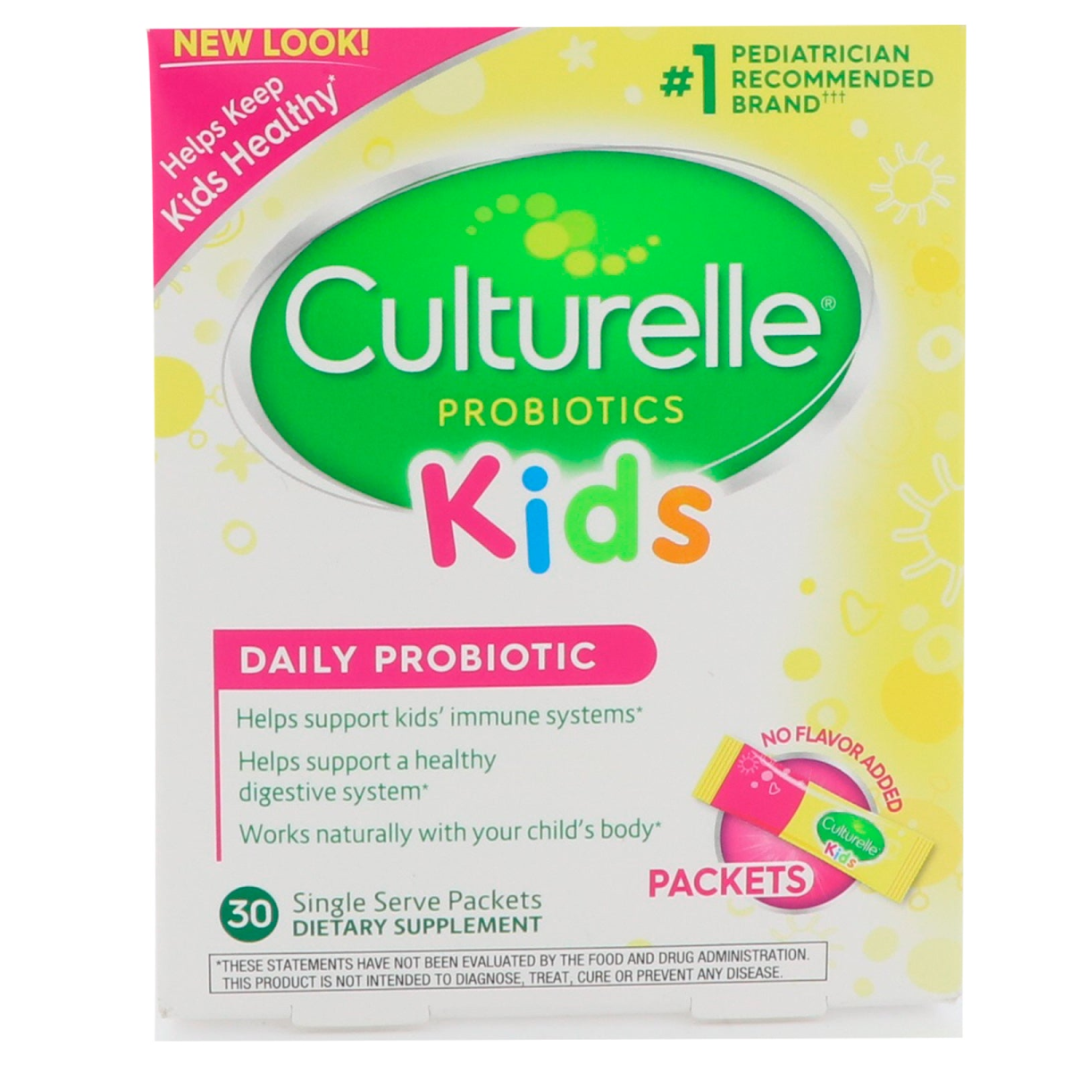 Helps Keep Kids Healthy #1 Pediatrician Recommended Brand††† Daily Probiotic Helps Supports Kids' Immune System Helps Support A Healthy Digestive System Works Naturally With Your Child's Body Dietary Supplement No Flavor Added Purity & Potency Guarantee We Certify That Our Products Meet The Highest Standards of Purity and Potency*** Help keep your kids healthy with Culturelle Kids Packets the #1 Pediatrician recommended brand.††† Culturelle Kids daily probiotic contains Lactobacillus GG, which works naturally with your child's body to help support both immune and digestive health. These safe and effective packets can be easily added to your child's favorite food or beverage to help keep them happy and healthy. Promotes Immune Support + Digestive Health The most clinically studied probiotic in children, Lactobacillus GG,†† helps support their natural immune defenses, by working in your child's core where 70% of their immune system resides. Restores the natural balance of good bacteria in their digestive tract to help support a healthy digestive system. Culturelle Kids. At the Core of Good Health. Help your kids live healthy with Culturelle at the core of their daily wellness routine. By making healthy choice today, your kids can maintain good health tomorrow. Only Culturelle Combines... The leading brand with 100% Lactobacillus GG§§. With Lactobacillus GG, the #1 World's Most Studied Probiotic in children with over 100 scientific studies.†† Guaranteed potency through the expiration date vs. just the time of manufacture.*** The #1 Pediatrician Recommended Probiotic Brand.††† Dairy-free.^ Gluten-free.♦ Sugar-free.‡ §§ Based on: Nielsen xAOC 52 weeks ending 11/26/16. ††Based on the number of Lactobacillus GG studies, as of May 2016. ***Guaranteed potency through date on box when stored as directed. †††Based on a 2016 survey among pediatricians recommending a probiotic brand. ^While there are no dairy-derived ingredients in the product, it is produced in a facility that also handles dairy ingredients. ♦Meets the FDA's guidelines for gluten-free. ‡Contains sucrose which adds a dietarily insignificant amount of sugar. Not a reduced calorie food.