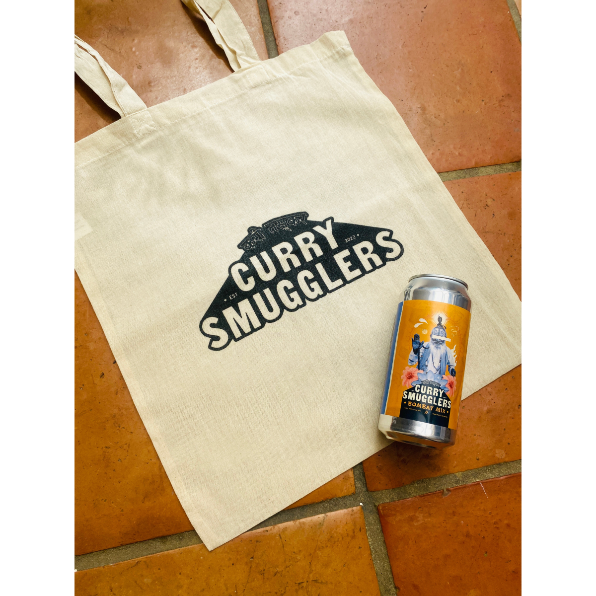 The Curry Smugglers tote bag, now available featuring our epic logo made for all your beer or snack can carrying needs.