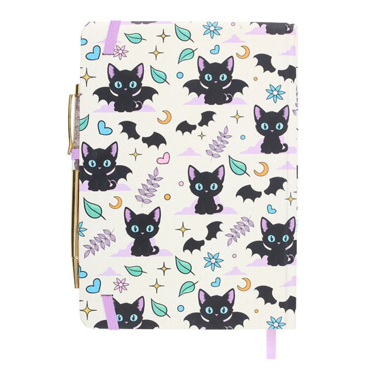 This A5 notebook is perfect for scribbling notes and ideas, featuring a playful black cat print and a matching amethyst chip pen. An ideal gift for feline-loving writers and witches alike. 100 sheets / 200 lined pages.