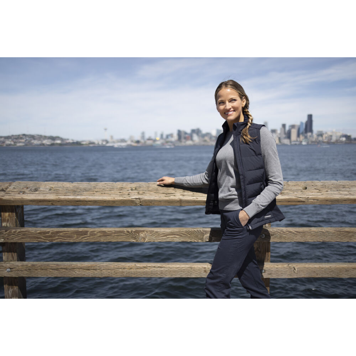 Oak Harbor is Cutter & Buck's hybrid vest that embraces the perfect balance of warmth, style and functionality. The stretch-polyester sides let you move in total comfort. Quilted and warming front and back panel insulated with Sustans® padding in renewable fibres from DuPont™ Sorona®. Sustans® Dupont™ Sorona® is made out of renewable fibers. The Sustans® production process uses 30% less energy and consists of 37% renewable fibers compared to common insulation materials. Fully zipped with YKK auto-lock zipper slider at front and pockets. Wear it as a layer above a sweater or half zip.- Hybrid vest that balances warmth, style, and functionality