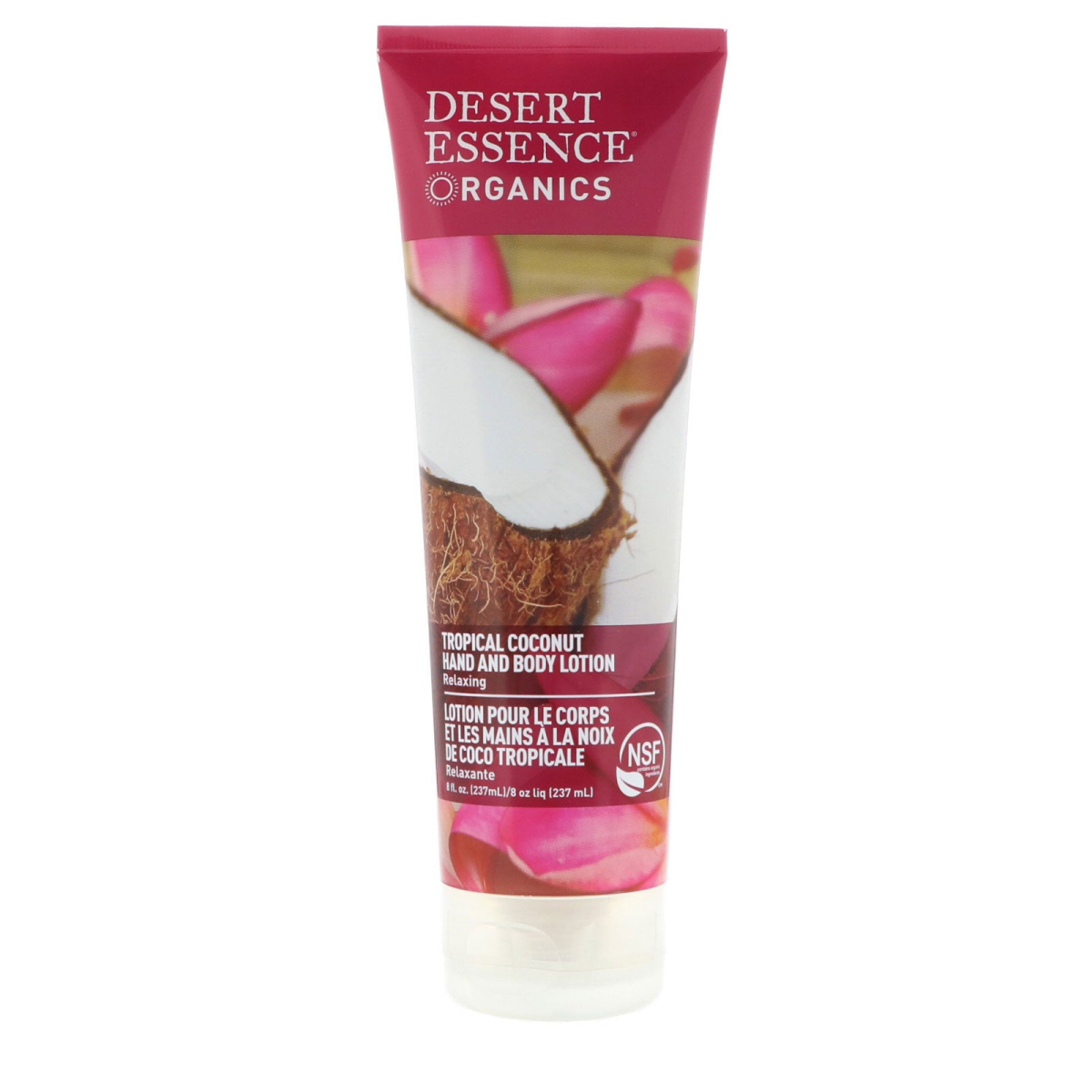 Relaxing NSF (Contains Ingredients) 100% Vegan / Wheat & Gluten Free Certified to NSF/ANSI 305 by QAI Leaping Bunny Certified Feel like you're on a tropical island with Desert Essence s Tropical Coconut Hand and Body Lotion. Contains coconut oil and Fair Trade shea butter to hydrate skin while Jojoba oil leaves skin soft and smooth. Cruelty Free and Biodegradable Formula: No animal testing of raw materials or finished product. No Phosphates.