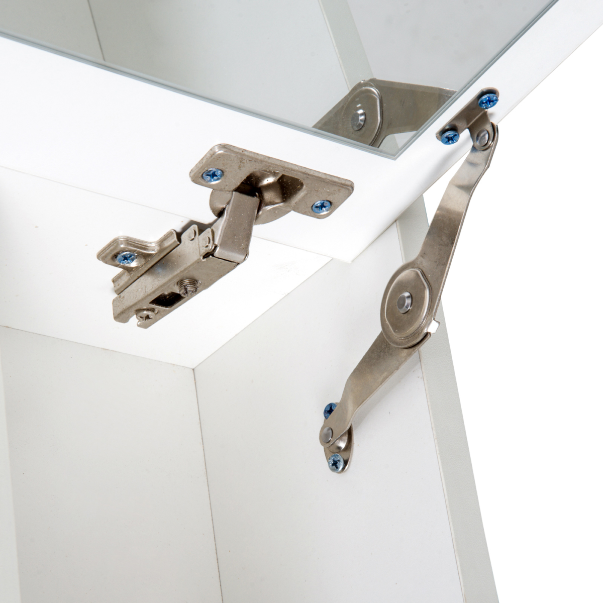 Flip-up mirror on the lid for convenient making upHidden space with removable divider under the lid for ample storageEasy to convert from a chic dressing table to a writing deskPadded stool with smooth leather and soft sponge for added comfortTable: 60.2L x 40.2W x 79H cm. Stool: 40L x 30W x 44H cm. Assembly required.