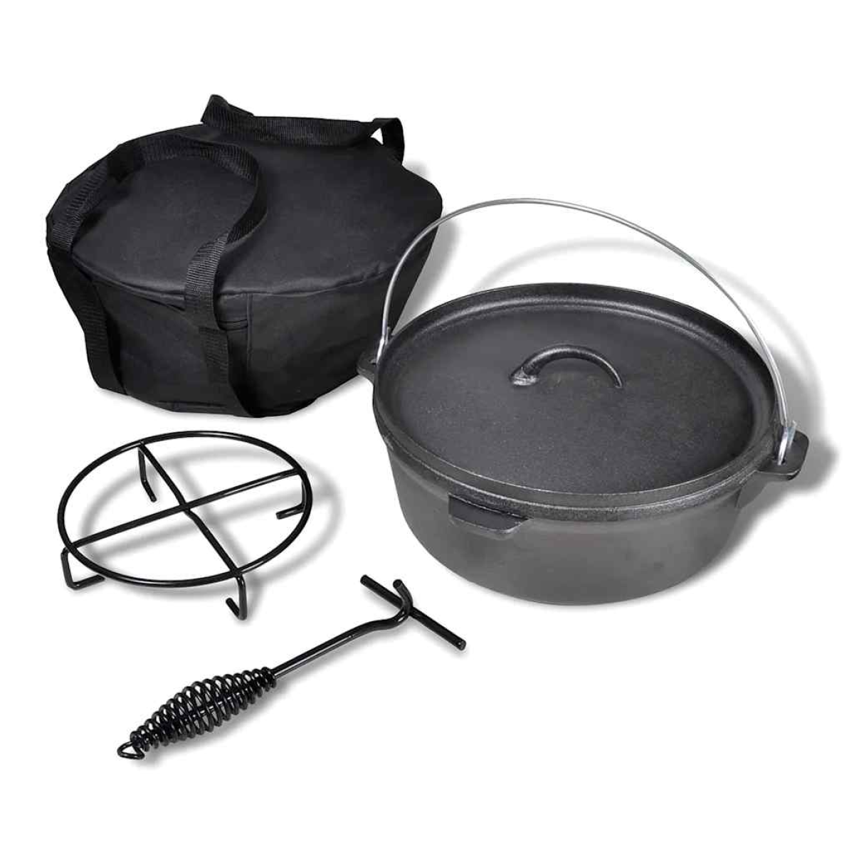 This Dutch oven, with a capacity of 5.6 L, is an ideal model for beginners and professionals alike. A Dutch oven can be used to make casseroles, stews, roasts, etc. This Dutch oven is delivered with a black carrying bag, a cover with a raised edge, a lid lifter and a stand. Made of high quality materials, this heavy-duty Dutch oven is highly durable. The included black carrying bag keeps the oven clean during transport. This Dutch oven is a versatile cooking tool for use at home or in the wild and will be ideal for cooking, baking and frying.