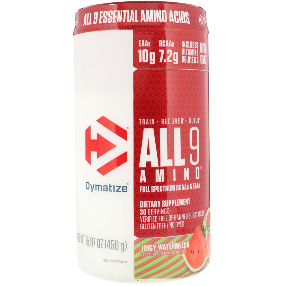 All 9 Essential Amino Acids EAAs 10 g BCAAs 7.2 Includes Vitamins B6, B12 & C Non-GMO Train-Recover- Build Full Spectrum BCAAs & EAAs Dietary Supplement 30 Servings Verified Free of Banned Substances Gluten Free/No Dyes Naturally and Artificially Flavored Informed-Choice Trusted by Sport Get Dymatized Informed-Choice.org Trusted by sport Informed-Choice is a quality assurance program that certifies that all nutritional supplements and/or ingredients that bear the Informed-Choice logo have been tested for banned substances by the world class sports anti-doping lab, LGC. All 9 Essential Amino Acids Training - Recovery - Build Effectively maintaining and building lean muscle mass requires all nine essential amino acids (EAAs). Ensuring your diet has all nine EAAs can be difficulty, so Dymatize has developed All 9 Amino - our most complete amino acid powder blend for optimal muscle protein synthesis (MPS) and training recovery support. All 9 Amino contains essential amino acids, such as BCAAs. Essential amino acids cannot be made by the body and must be acquired through protein consumption or supplementation. All 9 Amino supplies 10 g of EAAs, including 7.2 g of BCAAs. All 9 Amino is a serious muscle support product, promoting MPS and training recovery along with a game-changing flavor experience. Smooth, refreshing, delicious - enjoy All 9 Amino pre, post, during workouts or drink All 9 all day.