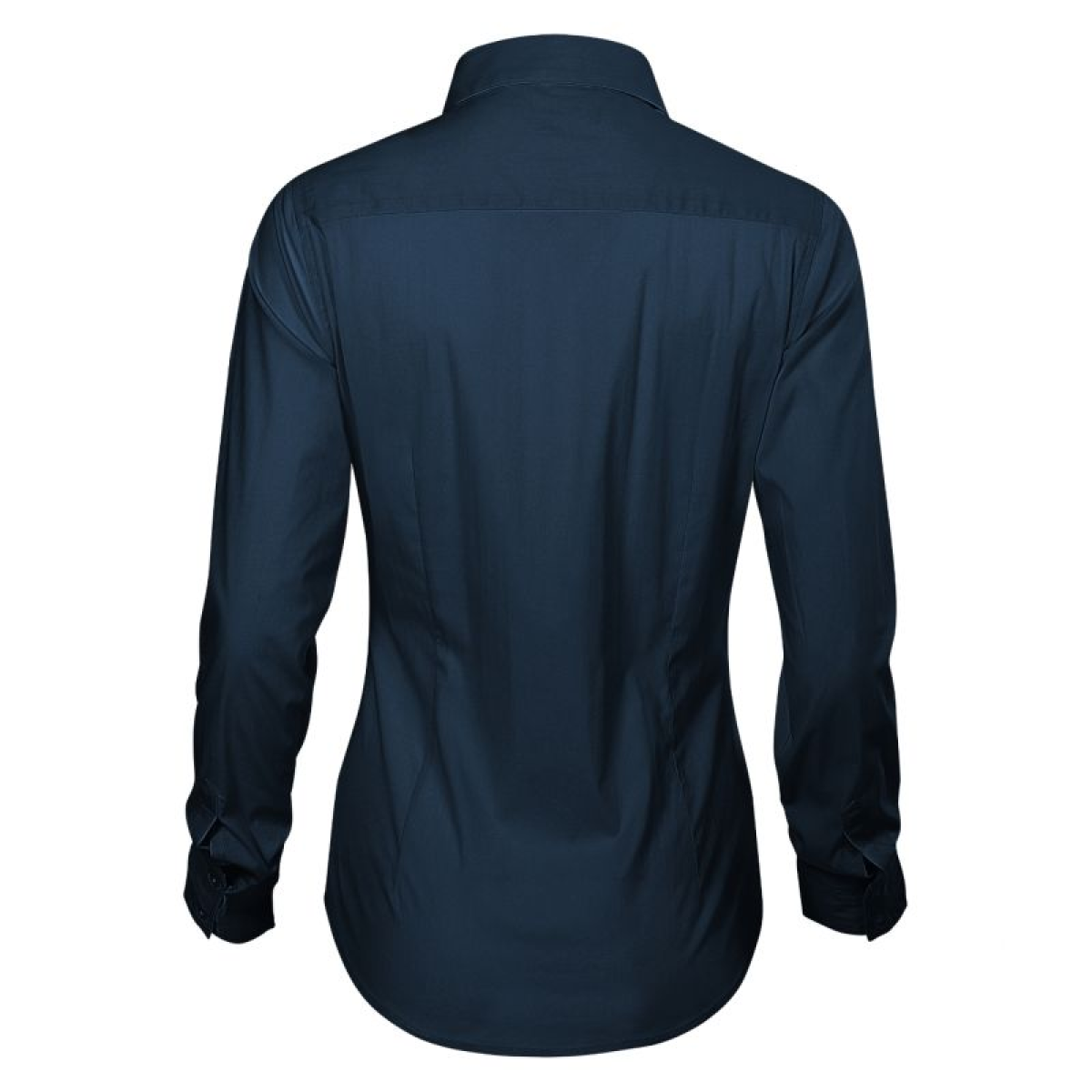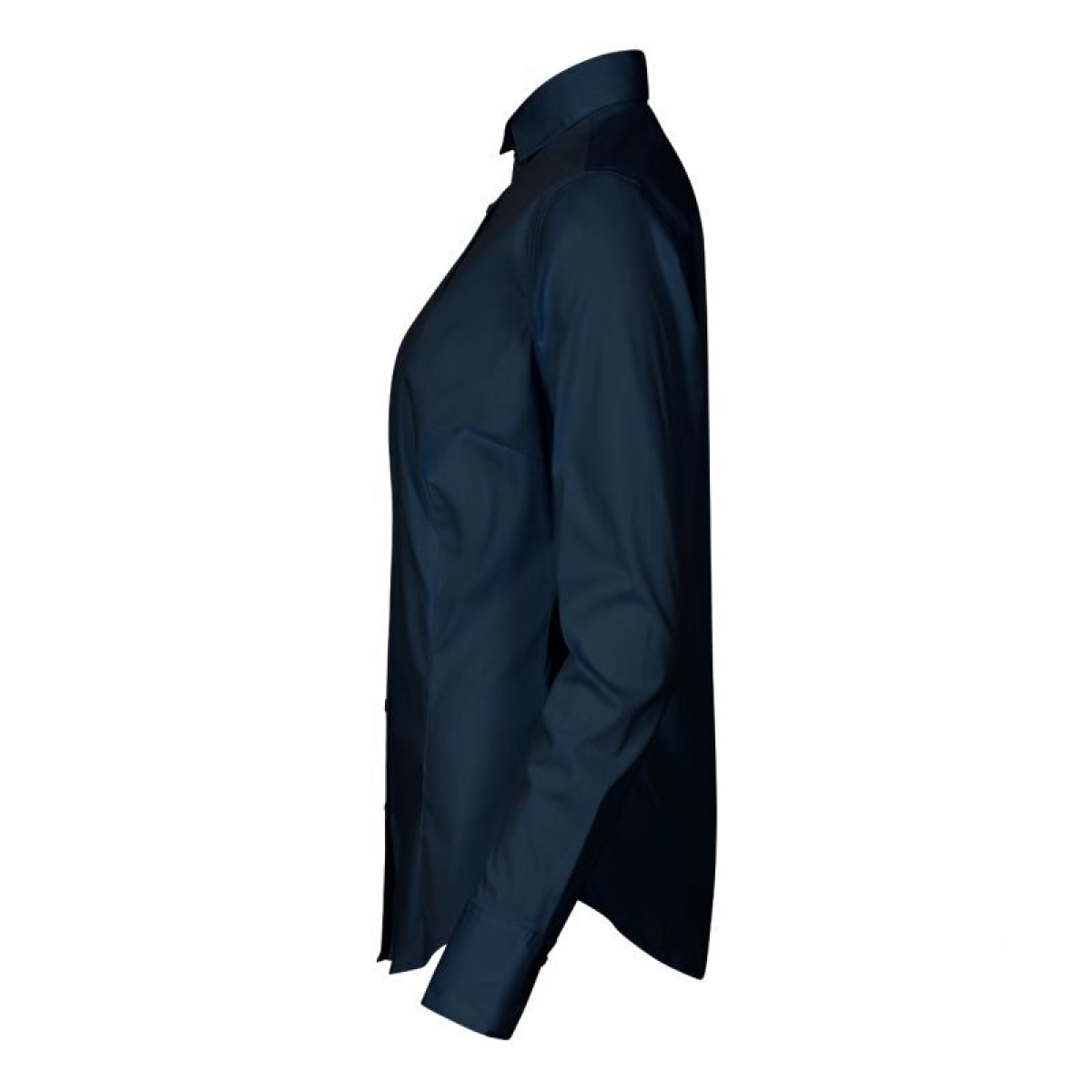 Plain weave, 68% cotton, 29% polyamide, 3% elastane, fitted cut with side seams, double yoke, darts emphasizing the feminine figure, shirt collar, front parts finished with a pleat, long sleeves with notched cuffs and 2 buttons, pearl buttons in the same color as the material (1 spare), rounded hem