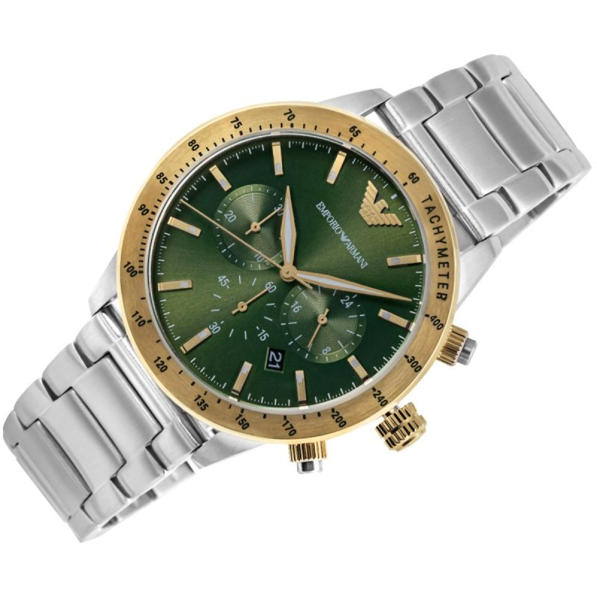 The Emporio Armani Mario AR11454 men's watch is an elegant and versatile chronograph that blends classic style with a modern character. The stainless steel case harmoniously complements the solid steel bracelet, creating a distinctive yet versatile look. The green dial, contrasting hands and indices, and the date window all emphasize the precise nature of this model. At the heart of the watch is a quartz movement, ensuring reliable operation without the need for daily adjustments, while the chronograph function allows for precise timing. The model boasts a 3 ATM water resistance, ensuring protection against accidental splashes during everyday use, making it an excellent choice for both everyday wear and more formal occasions.