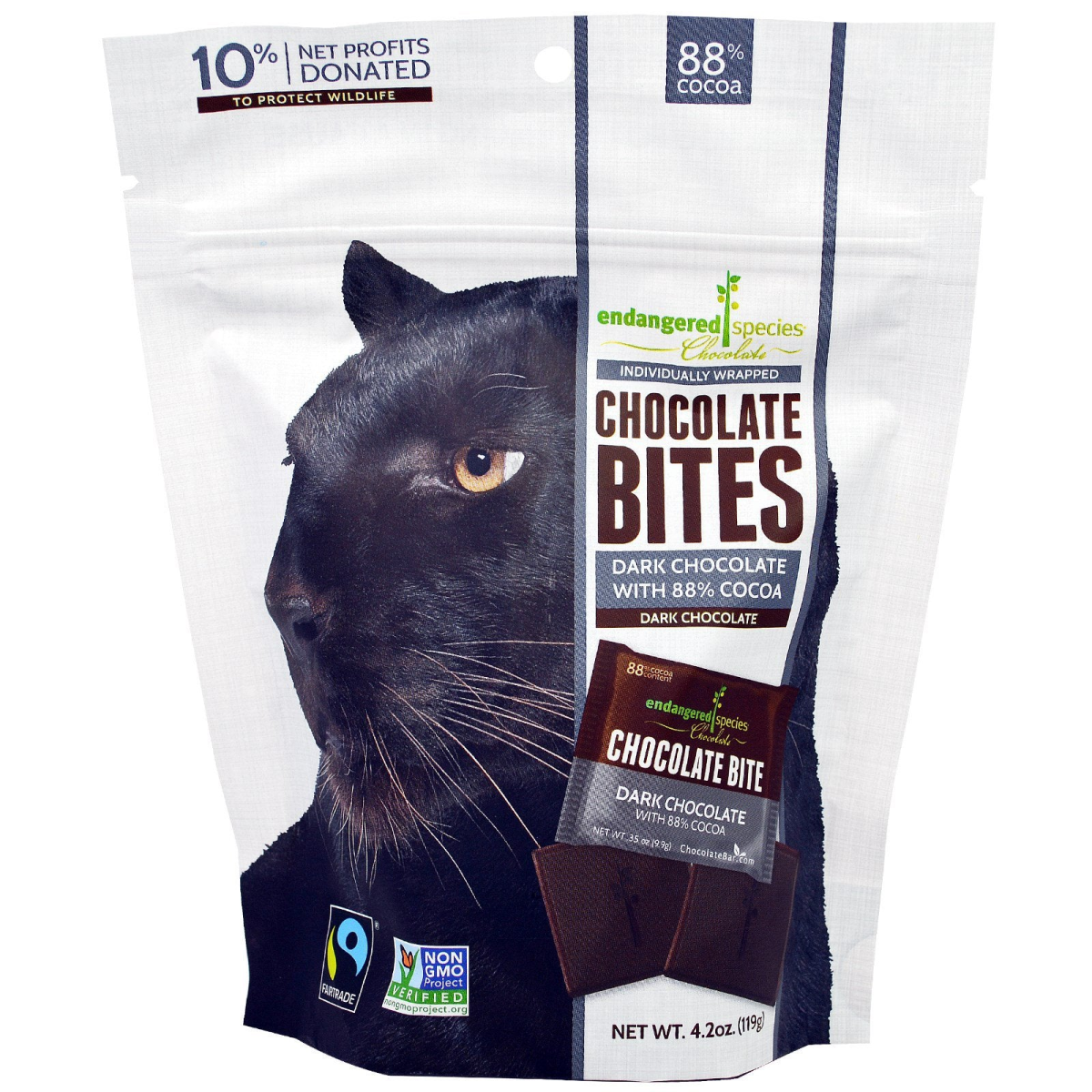 With 88% Cocoa Individually Wrapped Fairtrade Non-GMO Project Verified Certified Vegan Certified Gluten-Free Snack attack? Satisfy it with the perfect bite of velvety dark chocolate. Each bite helps to fund endangered species protection. The Jaguar (Panthera Onca) The Black Panther, while not in distinct species itself, is considered endangered by most due to declining numbers of leopards and jaguars in their natural ranges. Relative to its size, the jaguar has the strongest bite of any big cat. It possesses superior night vision and launches its best attacks under the cover of darkness.