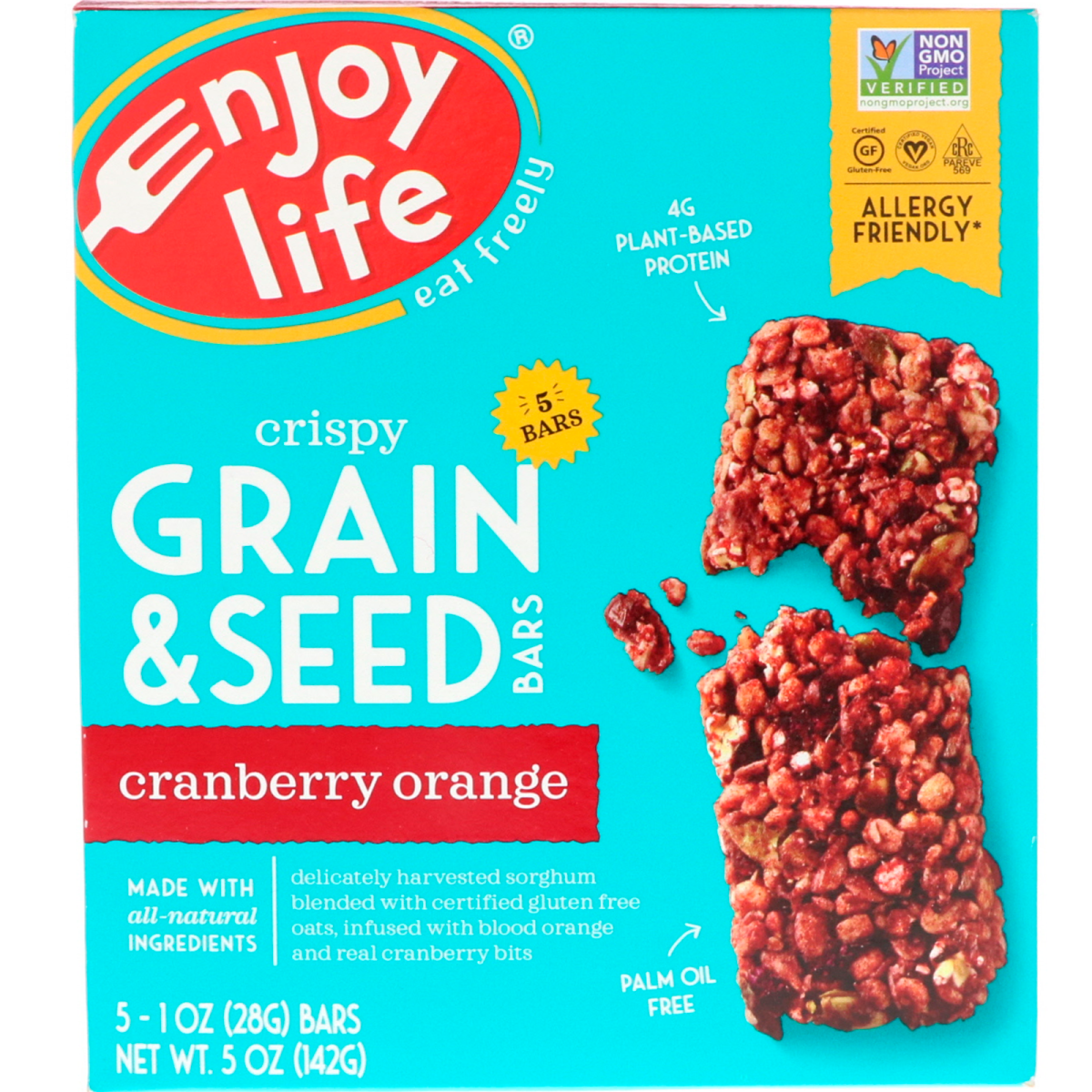 Eat Freely Get Ready For Some Serious Crunch! Non GMO Project Verified Certified Gluten Free Certified Vegan CRC Pareve Allergy Friendly 4 g Plant-Based Protein Made with All Natural Ingredients Palm Oil Free Delicately harvested sorghum blended with certified gluten free oats, infused with blend orange and real cranberry bits. . Since 2001 millions of people have enjoyed our foods without worry. With you in mind, our products are made using all-natural ingredients resulting in great-tasting products you can savor & trust. For any occasion, our products allow you to eat freely!