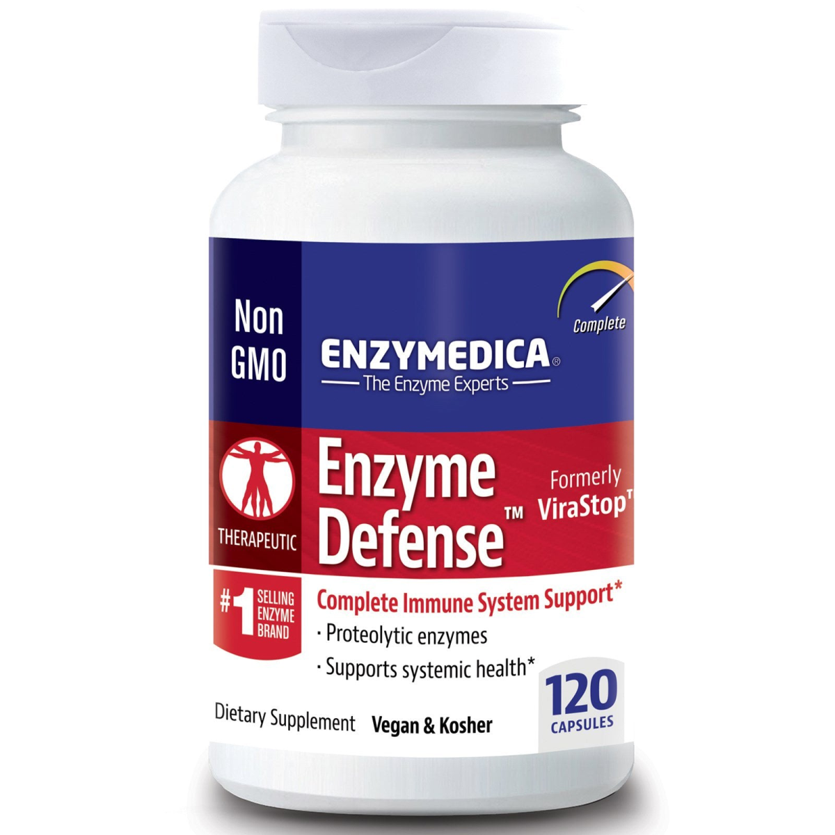 Non GMO The Enzyme Experts Complete Therapeutic #1 Selling Enzyme Brand Dietary Supplement Vegan & Kosher Parve No Fillers Added Complete Immune System Support Proteolytic Enzymes Supports Systemic Health The immune system is constantly faced with the challenge of protecting the body from environmental threats. Nearly all threats contain a protein component that the immune system must identify and break down. Enzymes that break down protein (proteolytic) can support this immune process. When the immune system is functioning optimally, systemic health is enhanced. Enzyme Defense contains an enzyme blend that provides support to purity the body and assist in removing proteins that do not belong in the bloodstream. This allows the immune system to focus on areas of need. Additional enzymes are included to break down excess mucus and promote healthy circulation. Enzyme Defense is not an "immune stimulate", rather a supporter of healthy immune function. Thera-blend is an exclusive process that combines multiple strains of enzymes that work in specific pH levels, resulting in superior performance in the body.