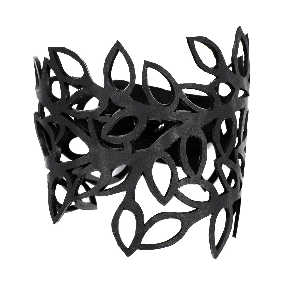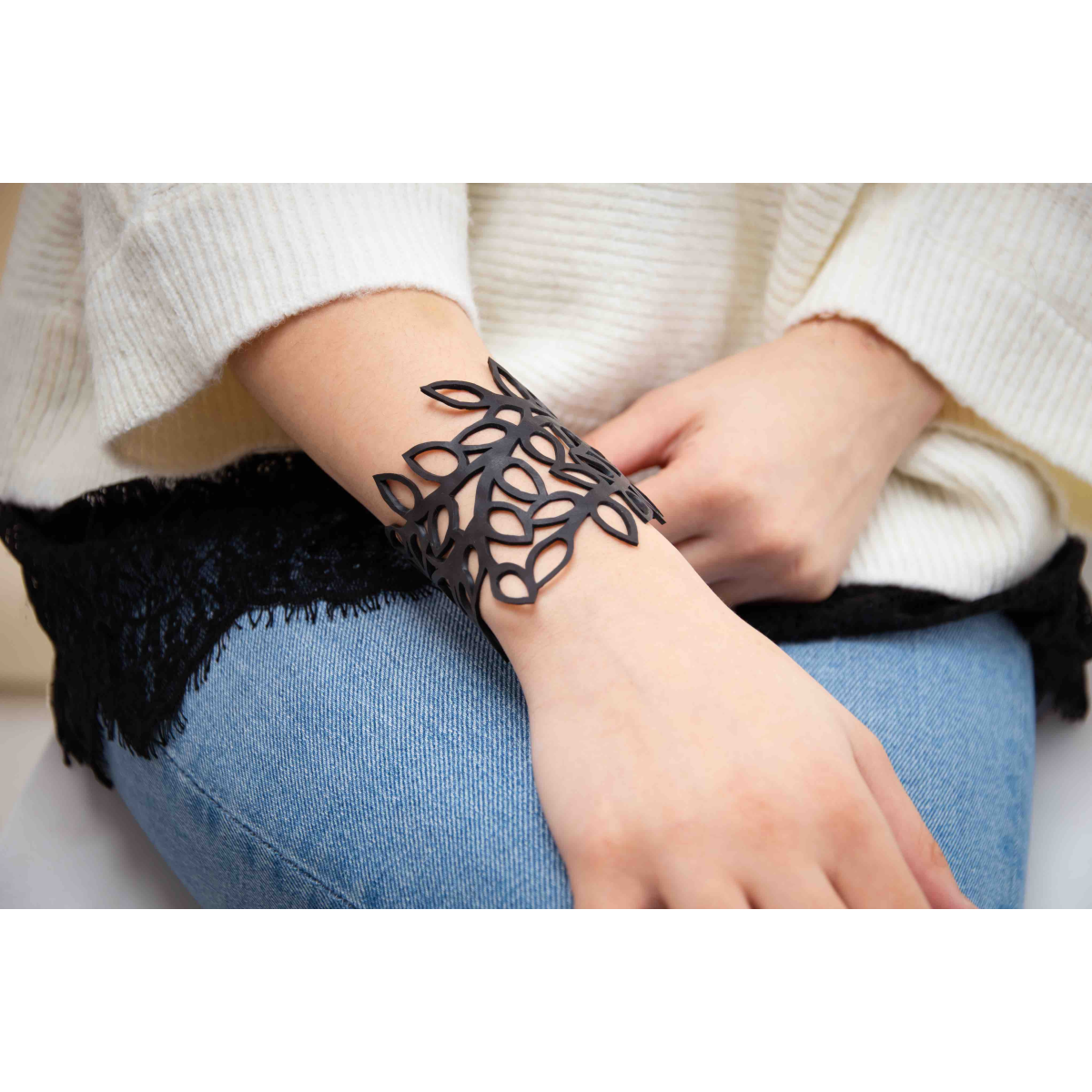 Our Evergreen Leaf Recycled Rubber Bracelet is handcrafted from a modest material, the reclaimed rubber of tyre inner tubes. The bracelet is hand cut, turning this ubiquitous and industrial material into an intricate and elegant piece of jewellery. It's a perfect piece of statement jewellery that will suit every season just like the evergreen leaf. Our artisan aims to use art, craft and fashion to bring hope for a greener future.