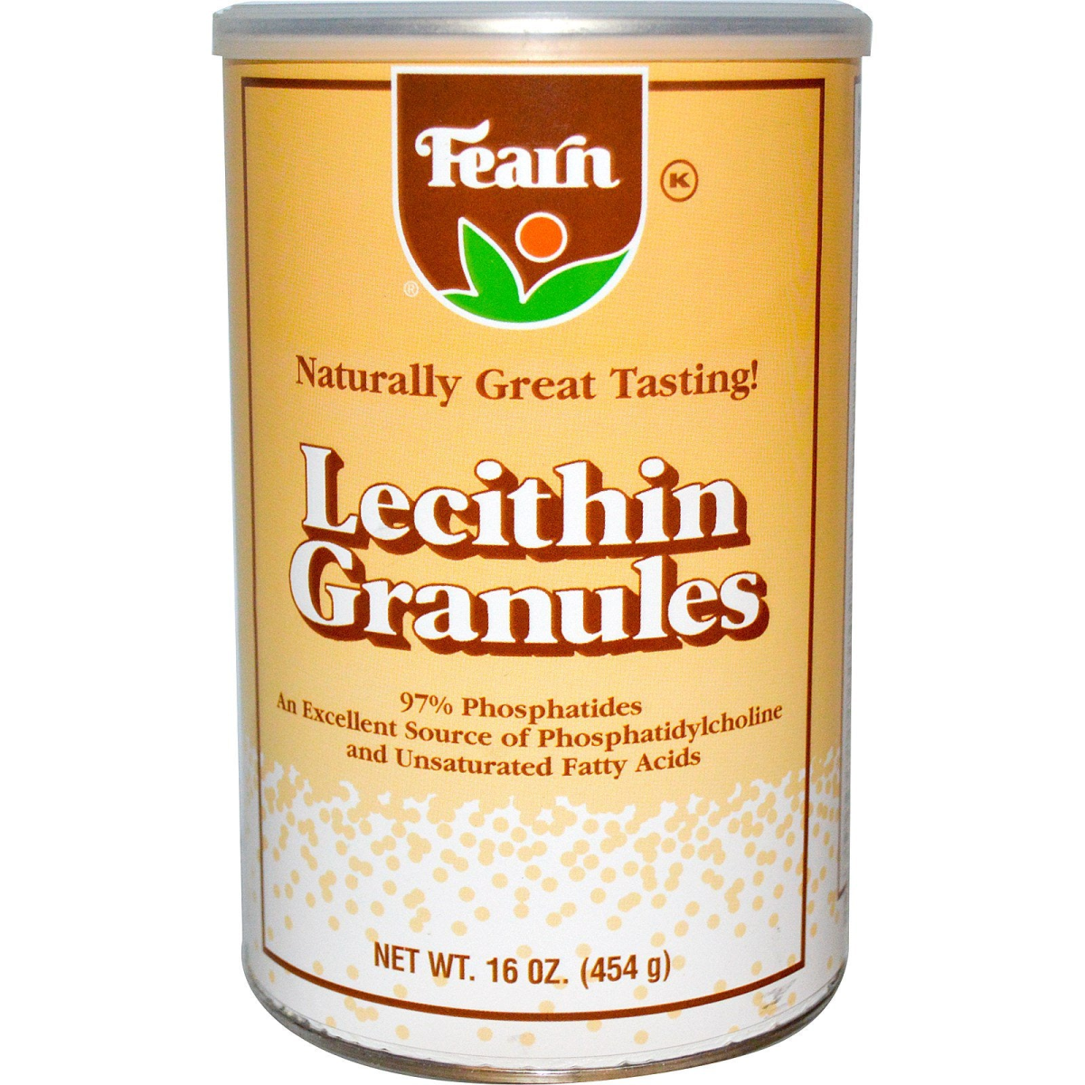 Kosher Naturally Great Tasting! 97% Phosphatides An Excellent Source of Phosphatidylcholine and Unsaturated Fatty Acids "Have You Had Your Lecithin Today?" Guaranteed Potency and Freshness Fearn Lecithin Granules contain 97% phosphatides, the highest concentration of any lecithin product available. Freshness is guaranteed by Fearn Natural Foods, leaders in lecithin and soy products for over 70 years. Fearn Lecithin Granules are pure lecithin. The high quality of this lecithin makes it unnecessary for Fearn to enhance the flavor or aroma with added ingredients. Nature put a small amount of lecithin into many foods. But with today's processing and refining methods of the foods we eat, much of the lecithin is removed. Lecithin is an important part of our diet. It helps our bodies emulsify fat and allows our bodies to digest it more easily. It also helps our bodies assimilate many of the other required nutrients in our diet. Fearn Lecithin Granules are high in phosphatidylcholine and phosphatidylinositol, giving us the whole complex of phosphatides. They are also an excellent source of essential fatty acids, including linoleic acid.