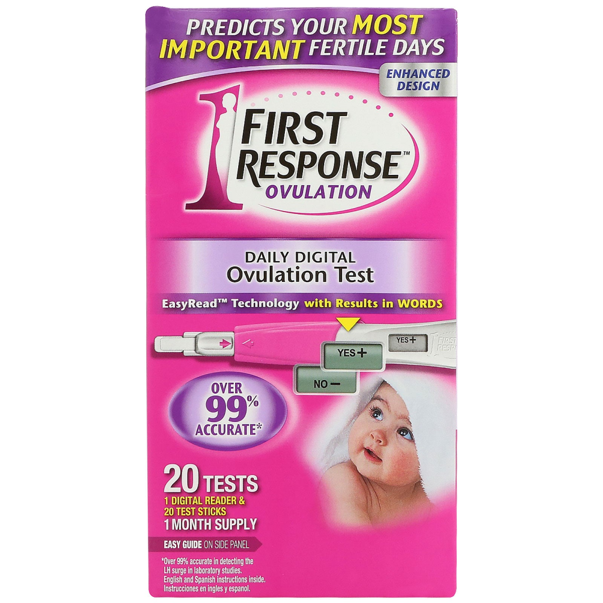 EasyRead Technology Predicts Your Most Important Fertile Days Enhanced Design EasyRead Technology with Results in Words Over 99% Accurate* 1 Digital Reader & 20 Test Sticks 1 Month Supply Easy Guide on Side Panel #1 Pharmacist Recommended Brand†This kit contains 1 First Response Digital Reader & 20 Test Stick and instructions (in English and Spanish) 1First Response Ovulation and Resolve The National Infertility Association Working together to help build your family If you are trying to build a family and it is not happening as quickly as you expected, you probably have many question. The maker of First Response is a proud sponsor of Resolve: The National Infertility Association. Resolve††is the nonprofit organization that since 1974 has been dedicated to providing the compassionate support, advocacy and education you need when faced with pregnancy challenges. First Response Daily Digit Ovulation Test is a highly sensitive test that measures LH surge based on your unique LH baseline, so it detects your surge even if your LH isn't as high as the average. This test features EasyRead Technology with simple, straightforward Yes+ and No - readouts to take the guesswork out of finding your fertile days because you begin testing on Day 5 of your period. Then you can test daily for up to the next 20 days, or until your reach your surge. Why Test for LH Surge? Your two most fertile day being with the LH surge. Therefore you are most likely to become pregnant if you have intercourse with 24-36 hours after you detect your LH surge. LH Surge Yes+ means you have detected your LH surge. Try to conceive within the next 24-36 hours. No LH Surge No - indicates that you have not yet reached your LH surge. Repeat test at the same time the next day. The Digital Reader will remember your LH hormone level from the previous day. *Over 99% accurate in detecting the LH surge in laboratory studies. English and Spanish instructions inside. †2011 Data on File. ††Resolve does not endorse specific products and brands.