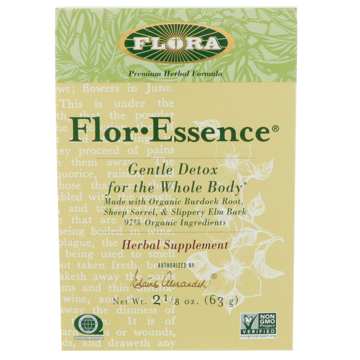 Premium Herbal Formula Made With Organic Burdock Root, Sheep Sorrel, & Slippery Elm Bark 97% Organic Ingredients Herbal Supplement Certified Organic by QAI Non GMO Project Verified Kosher Check Flor•Essence supports the whole body in its natural elimination process. Elaine Alexander, the late Canadian health researcher and radio producer/broadcaster, collaborated exclusively with Flora to produce Flor•Essence. This purification tea was entrusted to Elaine by Dr. Charles Brusch, M.D., personal physician to the late President John F. Kennedy. Dr Brusch was a partner in research and co-owner with the famous Canadian nurse, Rene Caisse, in perfecting this formula at his Cambridge, Massachusetts clinic. Flor•Essence is the only product on the market authorized to carry Elaine's signature on the packaging to vouch for its historical authenticity.