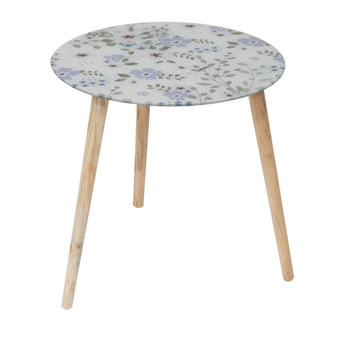 The 40cm glass table top features a delicate purple and pink floral design on a white background. Three natural finished wooden legs provide stability and contemporary chic style.