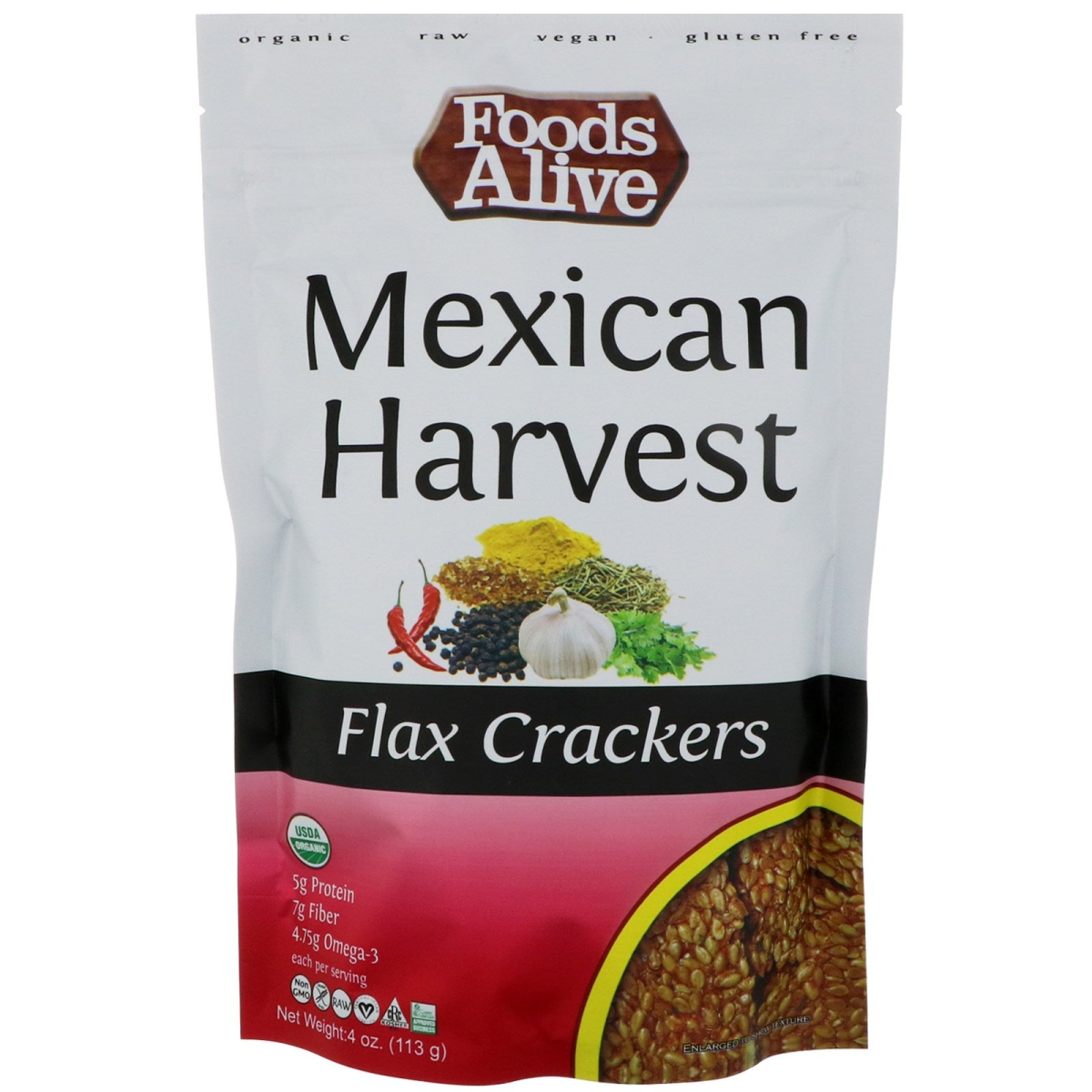 USDA Organic Raw Certified Vegan Gluten-Free 5 g Protein 7 g Fiber 4.75 g Omega-3 Each per Serving Non-GMO CRC Kosher Green America Approved Business Eats Like a Snack -Fuels Like a Meal Certified Organic by Ecocert Ico LLC Enjoy these awesome crackers right from the bag, use as bread, crumble on salad, or with your favorite dips and spreads! Inside this package, a unique blend of Mexican spices create a taco tasting cracker that goes great with dips, guacamole and gazpacho. Foods Alive is a family owned company dedicated to crafting healthy foods, because just like you, we care deeply about the food our family eats. So, you'll only find the highest quality certified organic ingredients in the foods we make. Our crackers come to life when we soak raw flax seeds in filtered water to begin the germination (or sprouting) process. This increases nutritional value, bioavailability and makes them easier to chew and digest. Then, we gently dehydrate our crackers overnight at a very low temperature. Our delicate process preserves the vital living enzymes and essential nutrients, while at the same time, creating a crispy, crunchy, savory snack. This attention to detail, allows us to craft all of our products with the highest quality of flavor, freshness and essential nutrition.