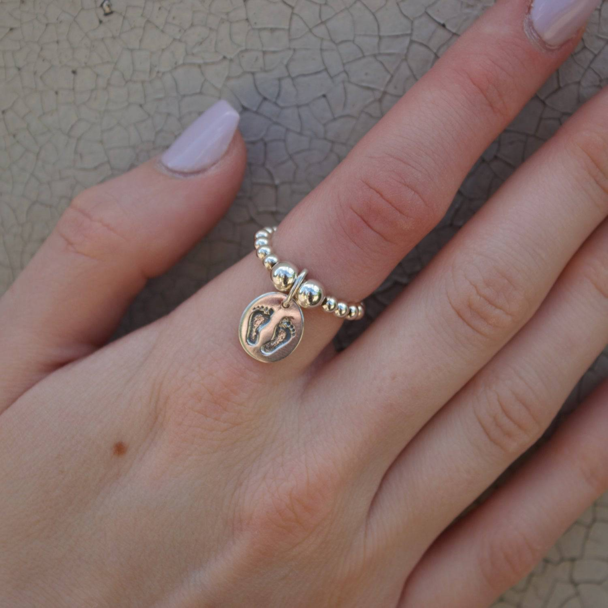 Elevate your jewellery collection with our Silver Ball Bead Ring with Footprints charm. These rings are handmade featuring 20 x 3mm sterling silver beads and 2 x 5mm sterling silver beads and a beautifully crafted footprints charm, symbolising new beginnings. These rings look great individually or stacked, and make for the perfect gift.