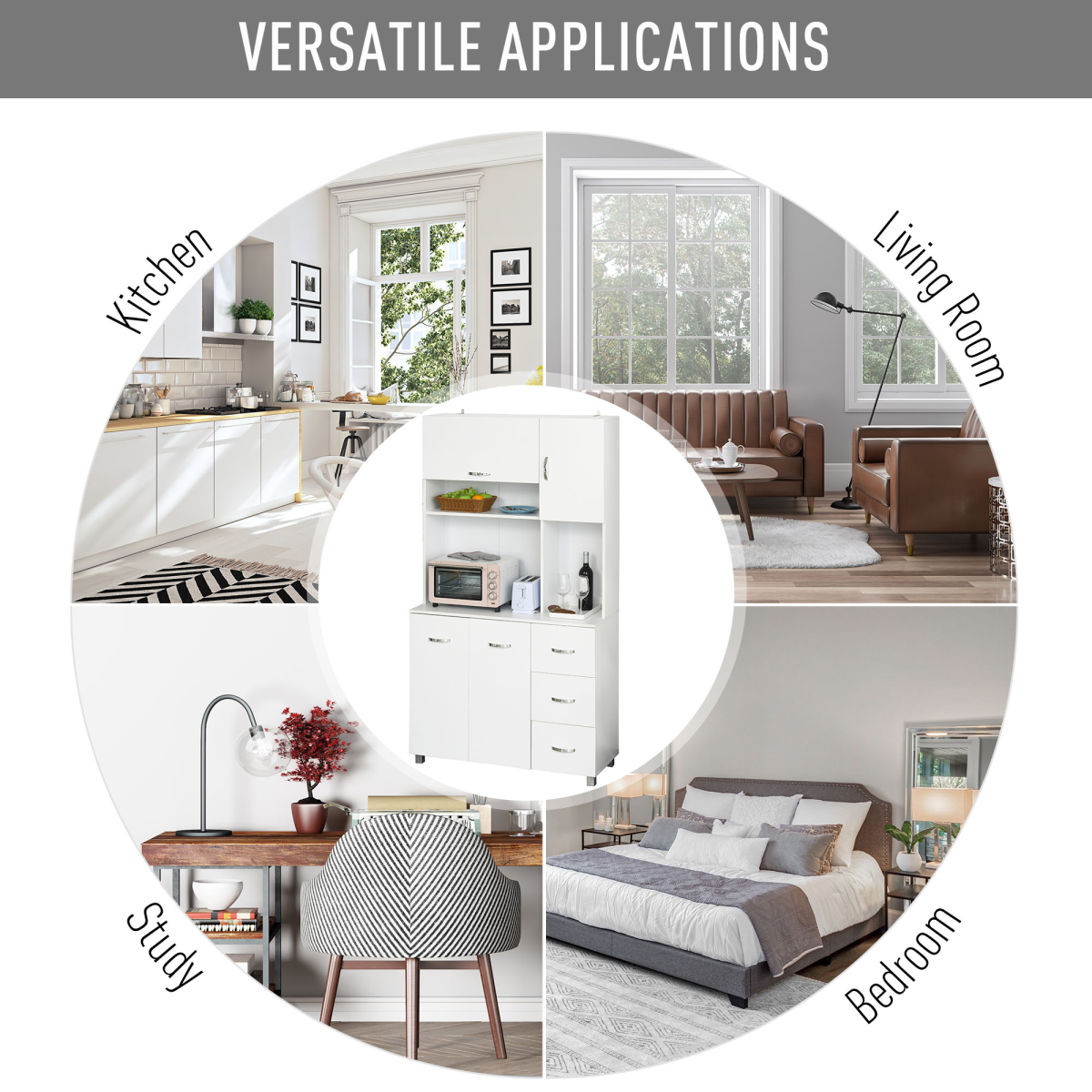 Fresh White Colour: Our kitchen storage unit features simple and fresh look which is versatile to stand easily by itself or mix in with your current kitchen furniture.Large Storage Space: Features three open compartments, three drawers, large bottom cabinet and two top cupboards, this kitchen larder cupboard gives you plenty of room for food, glasses, cutlery and more. Two cabinets are fitted with an adjustable shelf.Particle Board Frame: The tall storage cabinet with a solid formation, is suitable for everyday use. Smooth melamine coating all over for protection against light marks and stains.Four Elevated Feet: Provides continual balance and stability. DIMENSIONS: 183.5H x 100W x 39.5Dcm. Drawer inner: 12.1H x 27W x 33.7Dcm. Bottom cabinet: 71H x 64W x 36Dcm.Maximum Load? 100KG. ASSEMBLY REQUIRED.