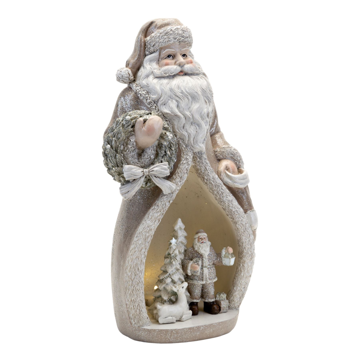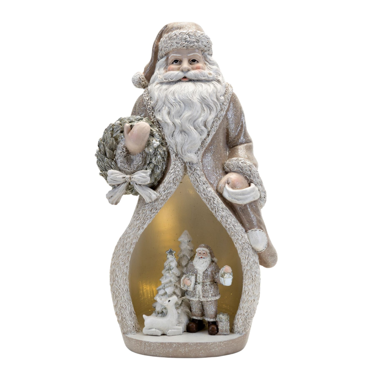 The resin Santa mould showcases a white and gold finish throughout, complete with touches of glitter. Within Santa�s coat sits a further miniature festive scene, backlit by LED lights.