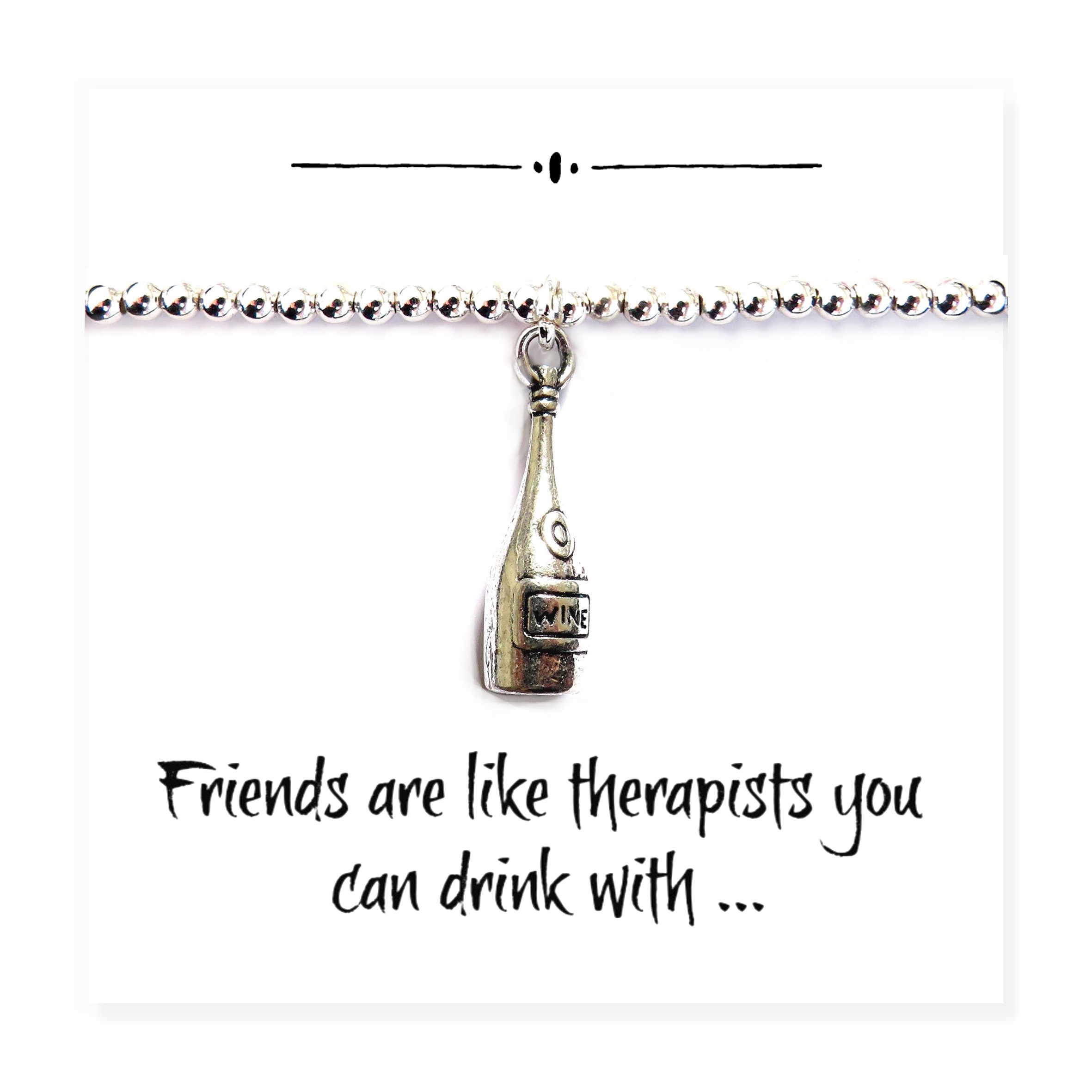 Our small wine bottle charm bracelet is a fun gift to give to a really good friend, it is presented on a message card with a humorous message that says "Friends are like therapists you can drink with", there is a small space for you write a little note or it can also be left blank which in turn is sent in a black gift box. So if you would like to say thank you to a friends for listening we are sure this little gift is sure to make her smile.