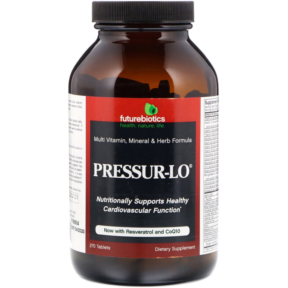 Health. Nature. Life. Nutritionally Supports Healthy Cardiovascular Function Now with Resveratrol and CoQ10 Dietary Supplement Pressur-Lo is a comprehensive formula that provides nutrients and other key factors to nutritionally support cardiovascular function. It includes Resveratrol, which research suggests may support cardiovascular health, plus CoQ10, which plays an essential role in keeping all body systems running smoothly. It is also potency enhanced with Futurebiotics exclusive BioAccelerators, including Lactospore probiotics, for improved nutrient absorption and utilization.