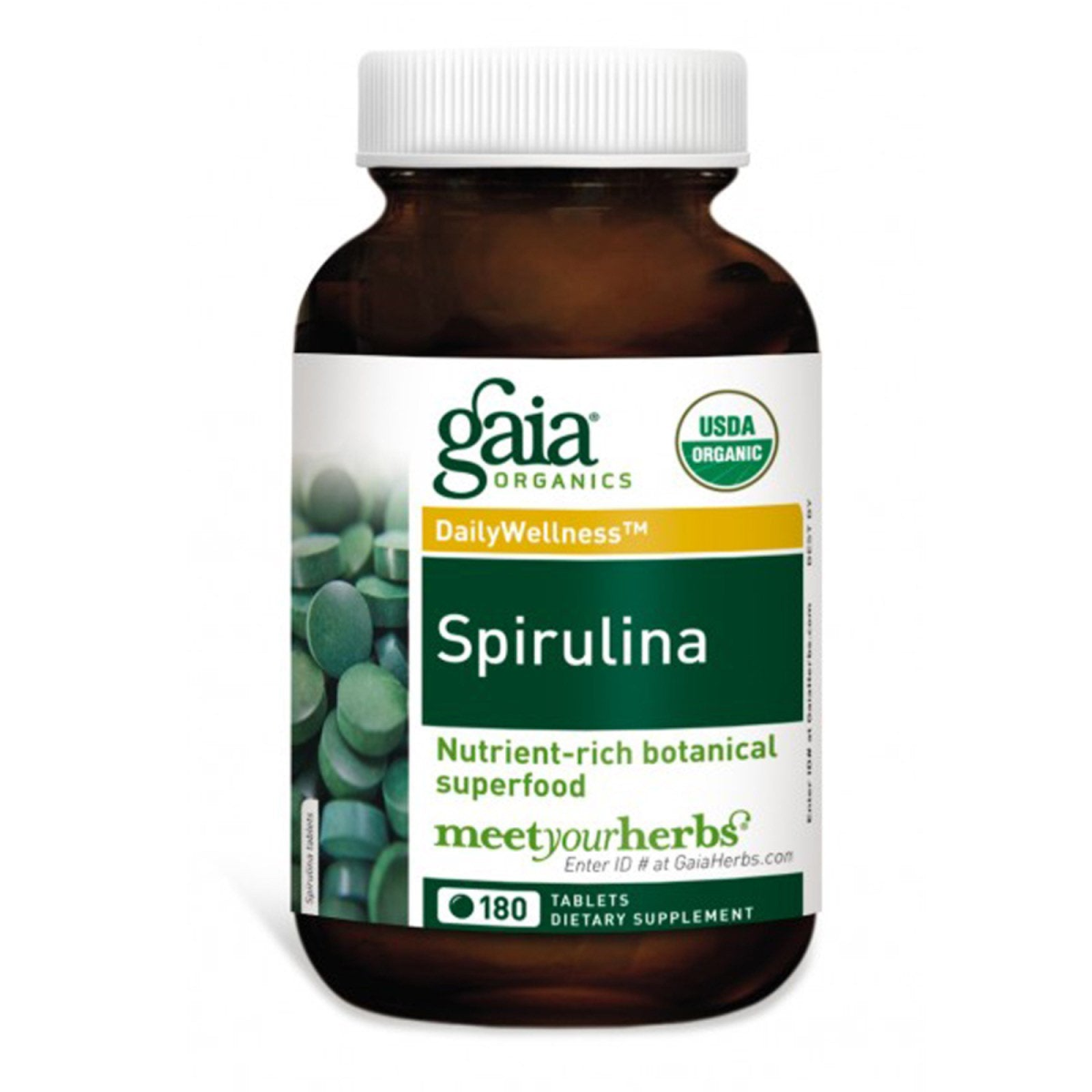 USDA Organic Daily Wellness Nutrient-Rich Botanical Superfood Dietary Supplement Certified Organic by Oregon Tilth Spirulina One of the simplest forms of life on the planet. These blue-green algae are a storehouse of nutrients. Spirulina is a vegetarian source of vitamins, minerals, chlorophyll and essential fatty acids. Gaia herbs tests each batch for purity and potency to insure absolute safety and validated wholefood nutrition.