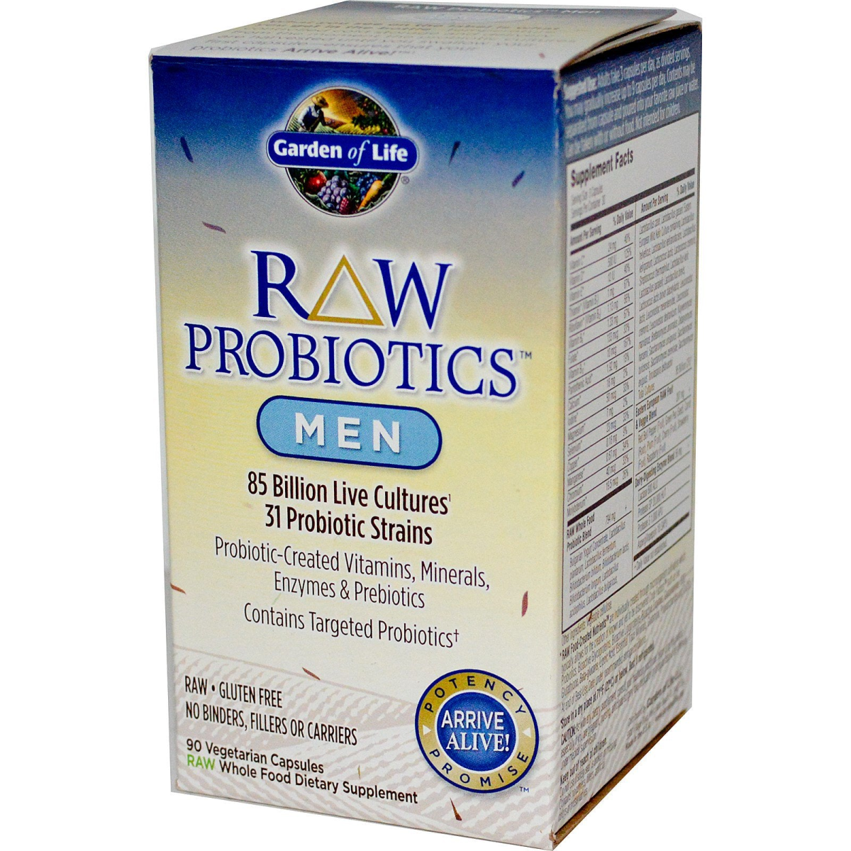 85 Billion Live Cultures 31 Probiotic Strains Probiotic-Created Vitamins, Minerals, Enzymes & Prebiotics Contains Targeted Probiotics Potency Promise - Arrive Alive! RAW Gluten Free No Binders, Fillers or Carriers RAW Whole Food Dietary Supplement Arrive Alive! Potency Promise What you see on the label is what you get in the bottle—temperature controlled cold storage and delivery from the moment the probiotic cultures are harvested until you swallow your first capsule—ensures that your probiotics Arrive Alive! RAW Probiotics The Next Generation of Digestive Health Garden of Life introduces RAW Probiotics—an innovation that goes Beyond Probiotics—whole food probiotic formulas providing 30+ powerful probiotic strains, along with probiotic-created cofactors including vitamins, minerals, enzymes, antioxidants and prebiotics. RAW means our probiotics are uncooked, untreated, unadulterated; with no binders or fillers and no carriers such as maltodextrin or dextrose. Original Probiotics Inspired by the Father of Probiotics, Elie Metchnikoff, RAW Probiotics provides probiotic strains found in Bulgarian Yogurt and Eastern European Wild Kefir—as recommended by Metchnikoff based on his study of Bulgarian longevity in the early 1900s and the probiotic-rich cultured dairy they consumed. RAW Probiotics provides RAW fruits and veggies sourced directly from the region where Metchnikoff made his probiotic discoveries. RAW Probiotics Men Colon Health Bowel Regularity Gut-Related Immunity Heart Health Prostate Health Healthy Stress Levels Garden of Life RAW Probiotics Men is a RAW, full spectrum, whole food probiotic formula specifically designed to meet the unique needs of men. RAW Probiotics Men offers 31 "original" probiotics specifically formulated for men to support immunity during exercise and physical exertion. RAW Probiotics Men also delivers probiotic-created vitamins, minerals and prebiotics as well as dairy-digesting enzymes to help break down lactose and casein. RAW Probiotics Men goes Beyond Probiotics offering a broad range of benefits specifically targeted for men: Supports colon health, bowel regularity and overall digestive function Supports gut-related immune system function and overall immune system health Supports healthy microbial balance by promoting healthy bacteria in the gut Supports healthy nutrient absorption and assimilation Relieves occasional gas and constipation Supports health stress levels as well as prostate and heart health