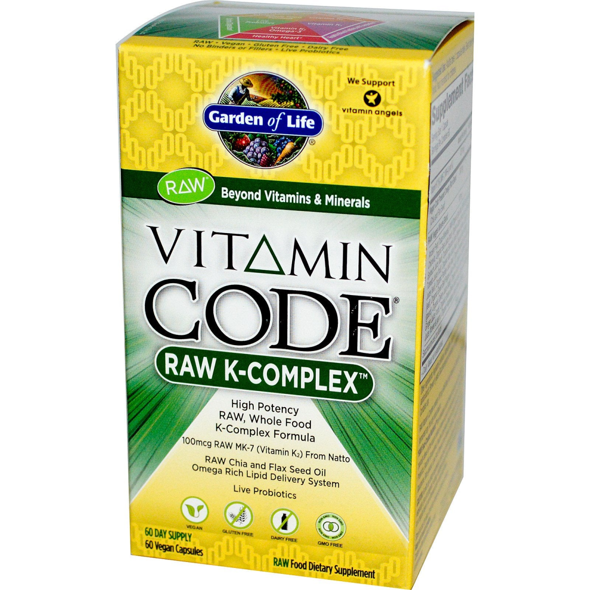 Raw Beyond Vitamins & Minerals High Potency Raw, Whole Food K-Complex Formula 100 mcg Raw MK-7 (Vitamin K2) From Natto Raw Chia and Flax Seed Oil Omega Rich Lipid Delivery System Live Probiotics Vegan Gluten Free Dairy Free No Binders or Fillers GMO Free 60 Day Supply Raw Food Dietary Supplement Non-GMO Project Verified Nature-Intended Benefits for Raw K-Complex Raw/Vegan- Whole Food Formula Bone Strength- Vitamin K2 Healthy Blood Clothing and Coagulation- Vitamin K2 Healthy Heart- Vitamin K2, Omega-3 Optimal Digestion- Live Probiotics Does Your K-Complex Formula Have The Code? The Code refers to the synergistic compounds found in food and necessary for proper nutrient delivery. Providing these Code Factors infuses the essential elements of whole foods that the body thrives upon. Raw Uncooked, untreated, unadulterated No binders or fillers No chemical isolates or synthetic nutrients Whole Food Living nutrients as nature intended Live probiotics and enzymes 17 Raw and ally grown vegetables Comprehensive Raw K-Complex Formula with Raw Food-Created Nutrients Bone Strength Healthy Heart Healthy Blood Clotting and Coagulation Optimal Digestion High potency Raw K-Complex provides 150% of the Daily Value for Vitamin K, including Raw MK-7 (Vitamin K2) which is gently extracted at low temperatures from fermented Bacillus subtilis Natto. Raw K-Complex features a Raw Veggie Mineral Blend of 17 Raw and ally grown vegetables, 75 ancient soil-based alkalizing trace minerals and includes live probiotics. Raw K-Complex delivers these fat soluble vitamins in their natural state for maximum use—inside a unique vegan, cold pressed Omega rich base from flax and chia seed oil. Go beyond vitamins and minerals with Vitamin Code Raw K-Complex Formula, providing Raw Food-Created Nutrients for bone strength, a healthy heart and optimal digestion.