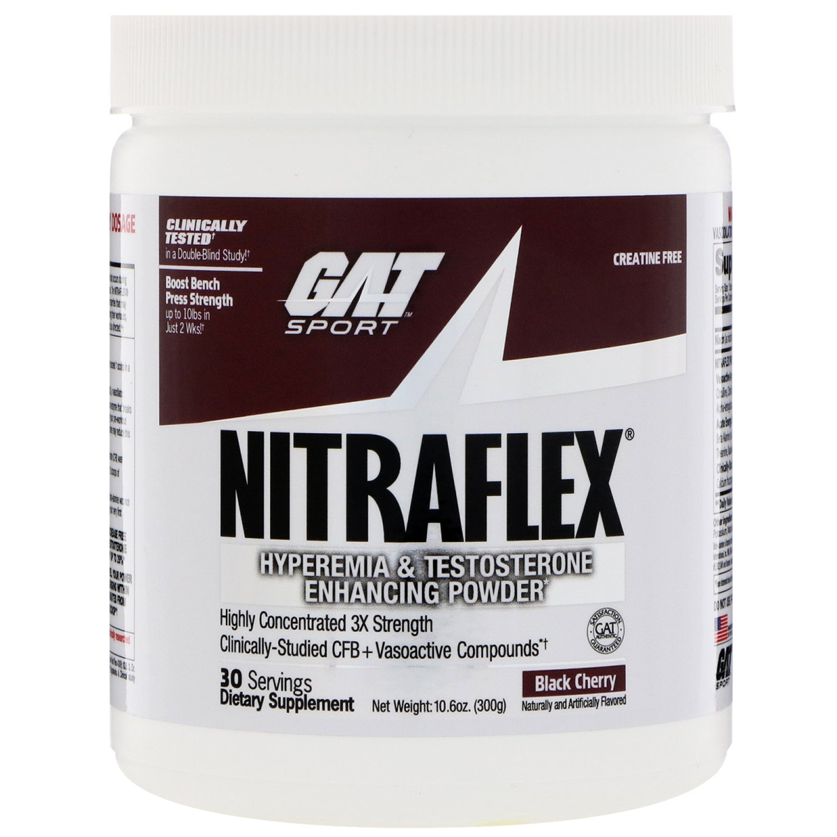 Welcome to TeamGat Clinically Tested in a Double-Blind Study!†Boost Bench Press Strength Up to 10 lbs in Just 2 Wks!†Creatine Free Hyperemia & Testosterone Enhancing Powder Highly Concentrated More Than 3X Strength Clinically-Studied CFB + Vasoactive Compounds†Satisfaction Guaranteed - GAT Authentic Dietary Supplement Naturally and Artificially Flavored Vasodilation Testosterone Reactive Hyperemia (Muscle Pumps) Strength Energy Hardness #CompeteHarder CarnoSyn - Carnosine Synthesizer Nutraceutical Facts: Physiological Basis: "Reactive hyperemia" describes the increase in muscle blood flow that occurs during high-intensity resistance exercise and produces the "pump" associated with increases in muscle size. The Nitraflex pre-training formula contains ingredients that in vitro, animal and clinical studies suggest possess properties that may help advanced athletes maximize energy, intensity, vascularity and reactive hyperemia (pumps) during their workouts, and provide long-term support of testosterone and nitric oxide levels in the healthy range when used as directed.†Unique Properties of Some of the Key Compounds in Nitraflex: 1-Scoop Serving: Nitraflex is so potent, only 1 scoop (1 serving) is necessary. Do not exceed 1 scoop in a single 24-hour period. Do not take Nitraflex within 5 hours of bedtime. High Citrulline:Arginine Ratio: Arginine is a proven precursor to nitric oxide (NO), a vasodilator. What most people don't know is that arginine supplementation stimulates the activity of arginase, an enzyme that breaks down arginine. Over time, this may actually result in reduced arginine and NO levels, in turn causing your pre-workout formula to stop working. Research suggests that supplementing with a high ratio of citrulline to arginine may reduce this risk by avoiding overstimulation of arginase.†CFB Helps Support Testosterone: In a clinical study, calcium fructopyranose borate (CFB) was shown to increase total and free testosterone within 3 hours of a single dose equivalent to just over 2 scoops of Nitraflex.†A longer-term study reported an increase in free testosterone by up to 29%.†Effective Dose of Beta-Alanine: The clinically-proven performance enhancer beta-alanine was not "fairy dusted" in this formula. Rather, we added a powerful dose that you will feel working following your very first serving. (May promote slight, tingly-cerebral sensation). Creatine-Free: Creatine causes water retention, which can make achieving a dry, hard muscular look even more difficult. Sometimes creatine is added to products precisely for this reason. We left it out of Nitraflex precisely for this reason. Thus making Nitraflex ideal for pre-contest prep and lean muscle physique.†Cognitive Enhancers: Nitraflex contains unique ratios of scientifically validated compounds that help you remain alert, intense and focused while you're flying from set to set with veins fully dilated and muscles pumped to the extreme. (DMAE)†Increase Free Testosterone By Up To 29% Feel Your Power Surging Within Minutes From 1 Scoop††Scientific References 1. Romero MJ et al. (2006). Cardiovasc Drug Rev 24(3-4): 275. 2. Sureda A et al. (2009). Free Rad Res 43(9): 828. 3. Dr. Natasha Miljkovic (MD) (2002). Study performed at the Department of Orthopedic Medicine. University of Novi Sad, Novi Sad, Yugoslavia. 4. Clinical study performed by VDF FutureCeuticals. 5. Study conducted by Dr. Patrick Jacobs (2012) Superior Performance Research.