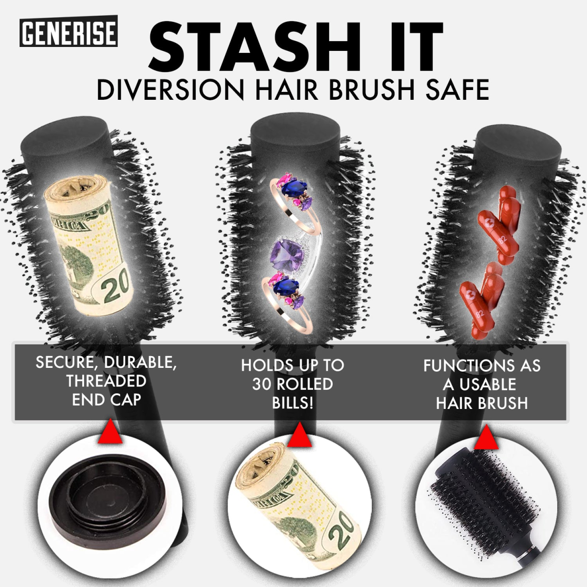 Our Large Hairbrush Is The Ideal Hiding Place For Your Valuable Items. The Secret Safe To Hide Your Secret Stash. Simply Unscrew The Lid And Place Your Cash, Jewellery, Vitamins, USB Or Whatever You Consider To Be Valuable To You Inside.