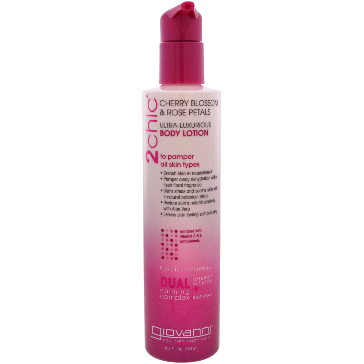 Dual Calming Complex - Cherry Blossom + Rose Petals Eco Chic Body Care 100% Vegetarian / No Animal Testing Beauty from the Elements is Chic on the Street Enriched with Vitamin C & E Antioxidants To Pamper all Skin Types Drench skin in nourishment Pamper away dehydration with a fresh floral fragrance Calm stress and soothe skin with a natural botanical blend Restore skin's natural elasticity with Aloe Vera Leaves skin feeling soft and silky 2chic or not 2chic? 2chic is to...indulge blissfully. Hand-picked Rose-petals, the fragile blossoms of the Cherry tree and other rare botanicals are gathered into an elegant bouquet enfolding your body in a sweet embrace of nourishment. Stress and fatigue can rob skin of all its youthful vibrancy. Take a moment to treat your body to a relaxing spa experience with our exclusive Dual Calming Complex. Moisturize underappreciated skin by indulging in precious botanicals that include Honeysuckle, Jasmine, Plumeria and Passion Fruit, flood your senses in a cascade that’s essential to skins elasticity leaving an immaculate and supple glow. *Inside each flowing Body Care product is a singular, care-full message: protective antioxidants, hydrating vitamins and nutrients, and skin soothers to indulge. Slip into Giovanni. Because it wears so well.