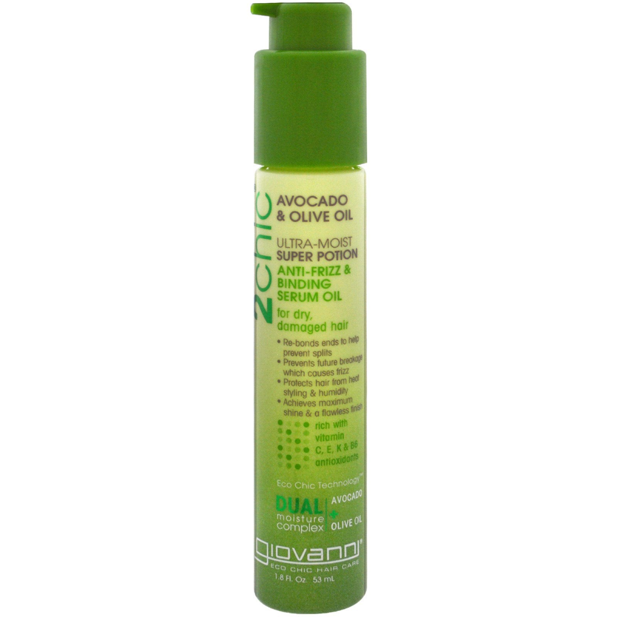 For Dry, Damaged Hair Re-Bonds Ends to Help Prevent Splits Prevents Future Breakage Which Causes Frizz Protects Hair From Heat & Styling & Humidity Achieves Maximum Shine & a Flawless Finish Rich with Vitamin C, E, K & B6 Antioxidants Eco Chic Technology Dual Moisture Complex - Avocado + Olive Oil Eco Chic Hair Care Beauty From the Elements is Chic on The Street 2chic or not 2chic? 2chic is to...polish Rebond damaged hair with 2chic Avocado and Olive Oil Super Potion Anti-Frizz & Binding Serum Oil. A delectable botanical blend of buttery Avocado and golden Olive Oil, formulated in our exclusive Dual Moisture Complex to replenish hair that feels dull, life and brittle. Our multi-tasking formula coats strands and fills in tiny imperfection in the hair surface, smoothing tresses out to a sleeks, smooth texture. Use as a treatment and/or styling tool. Will not strip or fade color. Ideal for hair that's heat-styled often, and 2chic to be denied. To be 2chic: Distribute evenly on dry or wet hair to smooth and defrizz. Great for heat styling. Use as a finishing tool to seal in shine. For maximum benefits, "cocktail" together with other 2chic products.