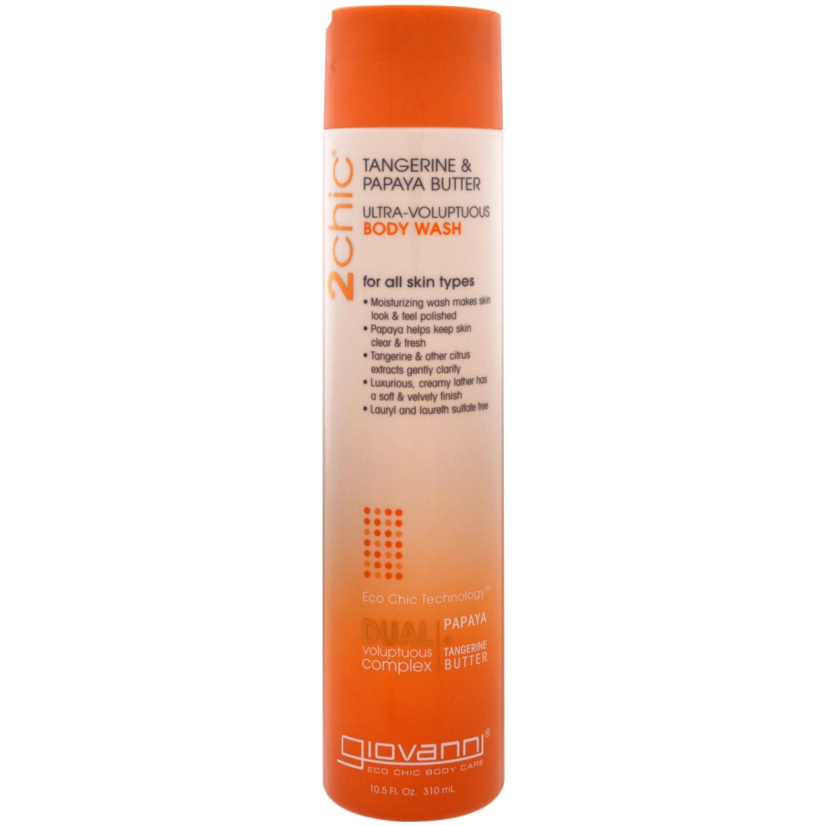 For All Skin Types Moisturizing Wash Makes Skin Look & Feel Polished Papaya Helps Keep Skin Clear & Fresh Tangerine & Other Citrus Extract Gently Clarify Luxurious, Creamy Lather Has a Soft & Velvety Finish Lauryl and Laureth Sulfate Free Dual Voluptuous Complex With Eco Chic Technology^ 2Chic Or Not 2Chic? 100% Vegetarian Ingredients No Animal Testing 2Chic is to reveal glowing skin. Quench your skin's thirst for tropical moisture with the essences of burst-fresh island fruits. The delicious blend of tangy Tangerine and nourishing, buttery Papaya in our exclusive Dual Voluptuous Complex moisturizes and energizes revealing softer, dewy-fresh skin. This indulgent body wash simultaneously polishes and moisturizes for skin that is voluptuously soft as an island breeze. Blended with clarifying Grapefruit, Ginseng and mouthwatering vanilla - taking 2chic to new heights. To be 2chic in shower or bath, enjoy ultra-voluptuous Body Wash to leave skin pristine, moist and balanced. Create a light lather using a sponge, loofah or washcloth. Foam away dirt and impurities, and rinse. Follow with ultra-voluptuous body lotion. ^Inside each following Body Care product is a singular, care-full message: protective antioxidants, hydrating vitamins and nutrients, and skin soothers to indulge. Slip into Giovanni. Because it wears so well.