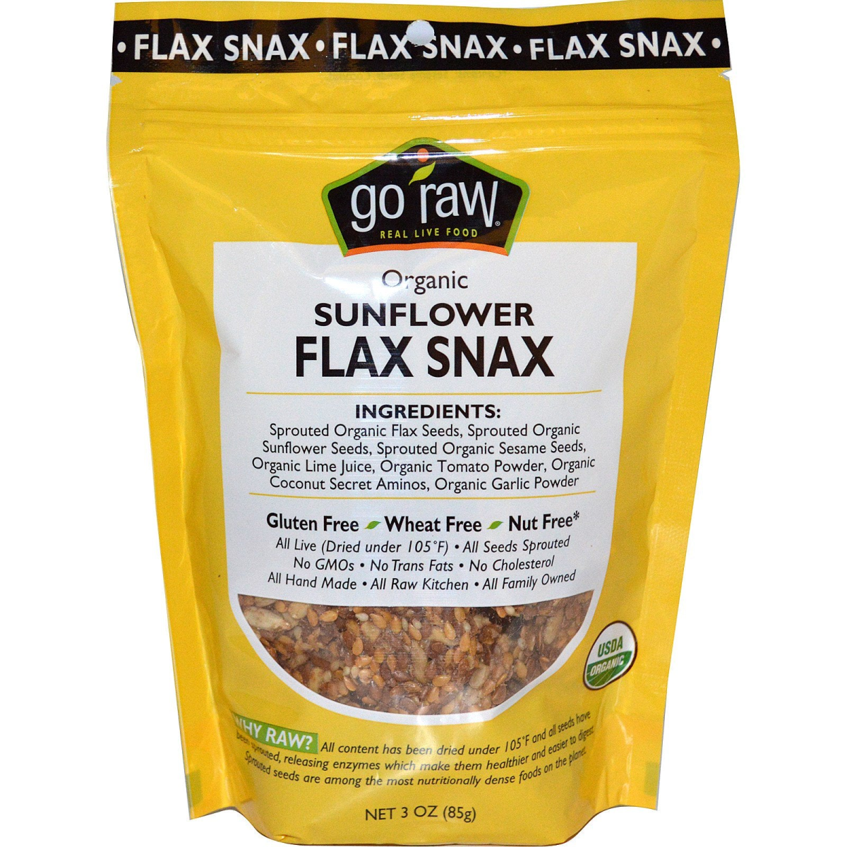 Real Live Food Certified Gluten Free Wheat Free · Nut Free* All Live (Dried Under 105ºF) All Seeds Sprouted No GMOs No Trans Fat No Cholesterol All Hand Made All Raw Kitchen All Family Owned USDA Raw Vegan Certified by Certifiers High in Fiber 5 g Protein** 300 mg Omega-3** 200 mg Omega-6** Kosher *Contains: Sesame Seeds, Coconut. **Per Serving Why Raw? All content has been dried under 105ºF and all seeds have been sprouted, releasing enzymes which make them healthier and easier to digest. Sprouted seeds are among the most nutritionally dense foods on the planet. The Healthiest snack in the world! Sprouted flax seeds are chewable and easier to digest than raw flax seeds. No Need To Grind! These are awesome broken over salads or right out of the bag! Creating Real Live Food is Our Passion We Source the Best: The very best seeds are selected, preferably from local growers. We Sprout with Care: The seeds are optically sorted, soaked in filtered water, rinsed, then sprouted to perfection. We Craft the Finest: The finest ingredients are mixed in, then hand spread on trays. The mix is loaded into custom-built dehydrators and slow dried at an average 98ºF to maximize enzymatic and nutritional integrity and flavor. We Pack with a Promise: Our products are packed and refrigerated exclusively in-house on dedicated equipment for uncompromised taste and freshness. Our Pledge: Provide the healthiest, most flavorful foods ever made. No nonsense. No gimmicks.