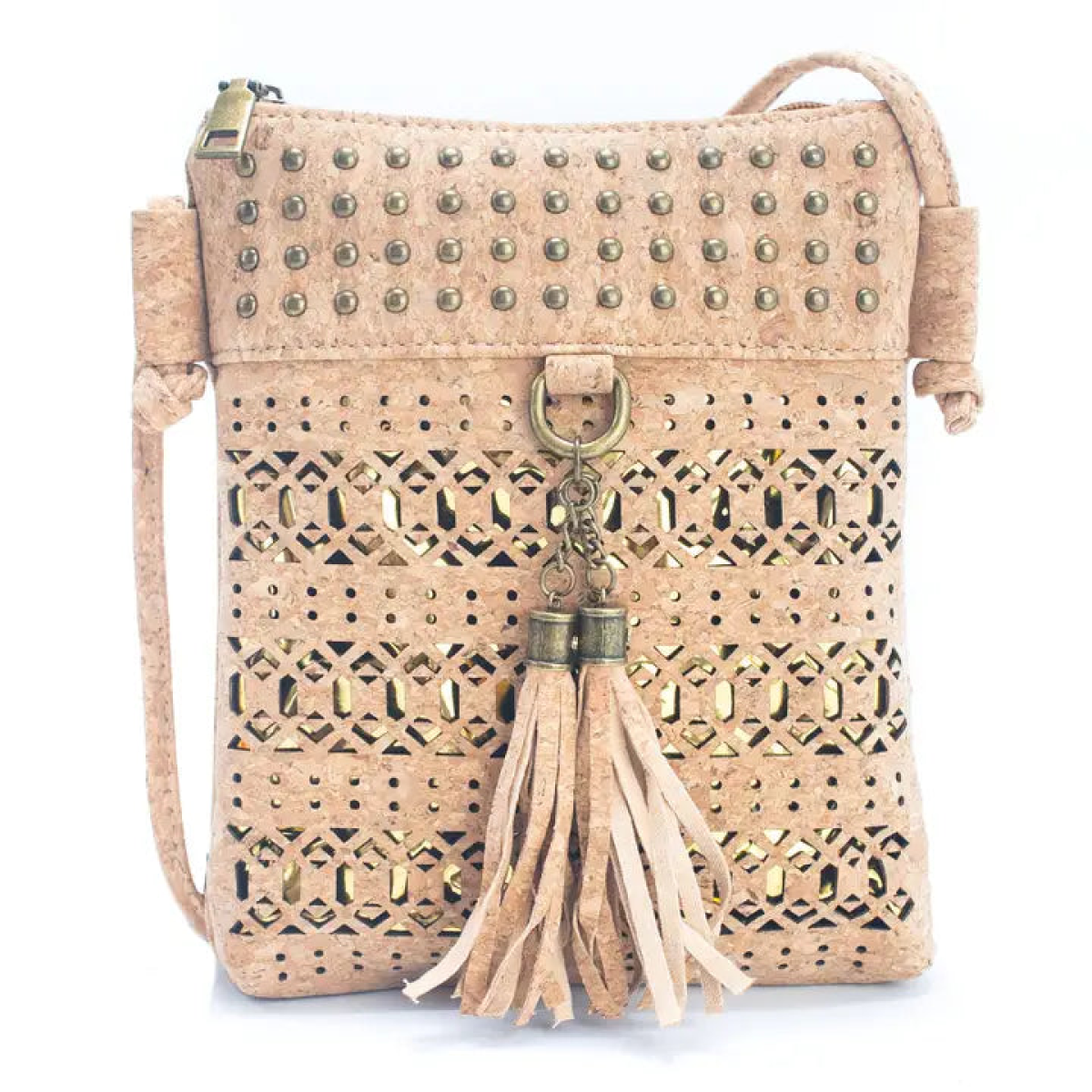 This stylish crossbody bag for women is made with natural cork material and is available in three different styles: gold and cork, silver and cork, and original cork. The bag features plenty of compartments and zippered pockets to keep your belongings organized and easily accessible. The hardware is sturdy, and the bag is adorned with a fringe zipper accent for added style. This fashionable and environmentally conscious bag is a must-have accessory.