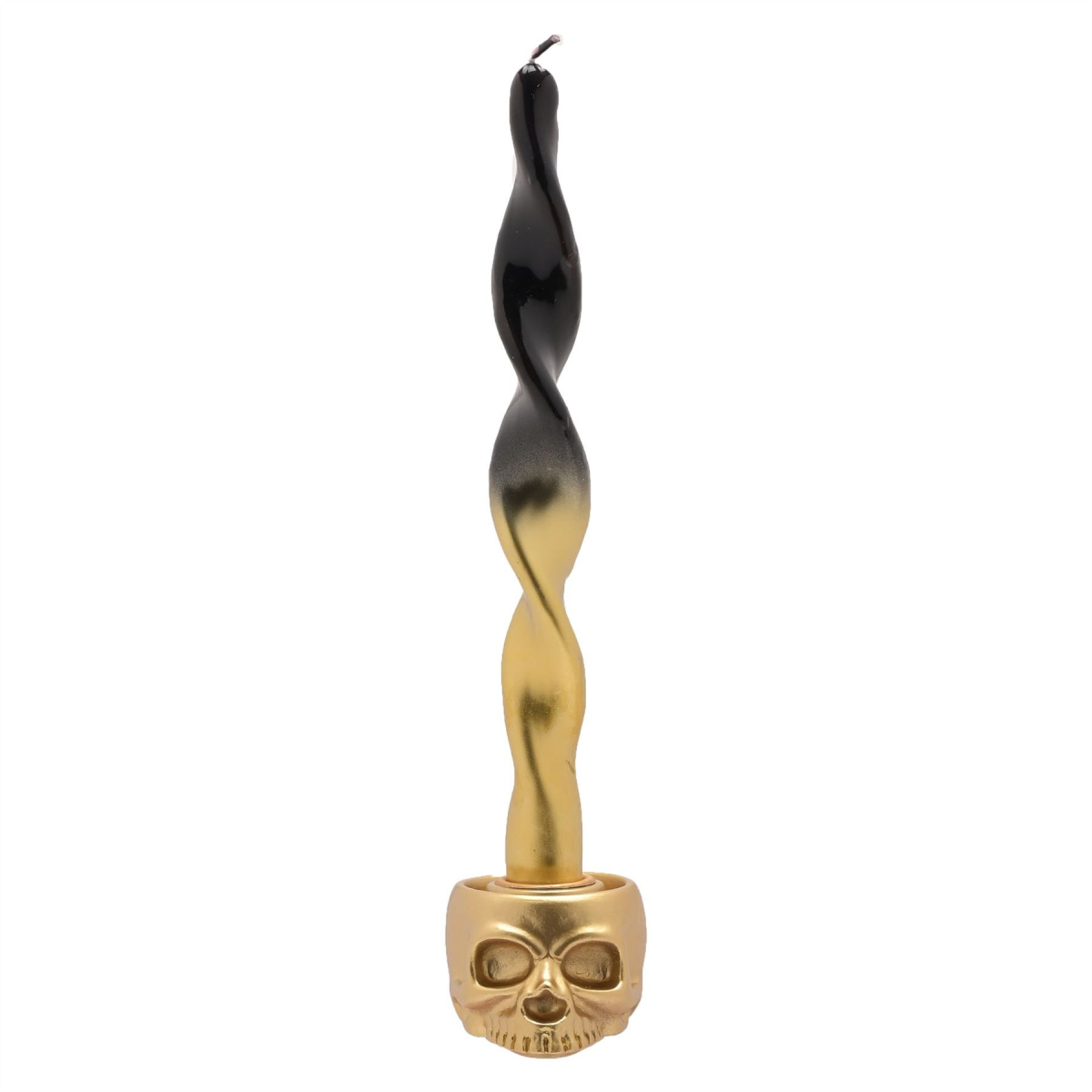 The gold resin holder showcases a detailed skull mould with a metallic effect finish. It perfectly holds a traditional candlestick of choice and makes an eye-catching display piece during the spooky season.