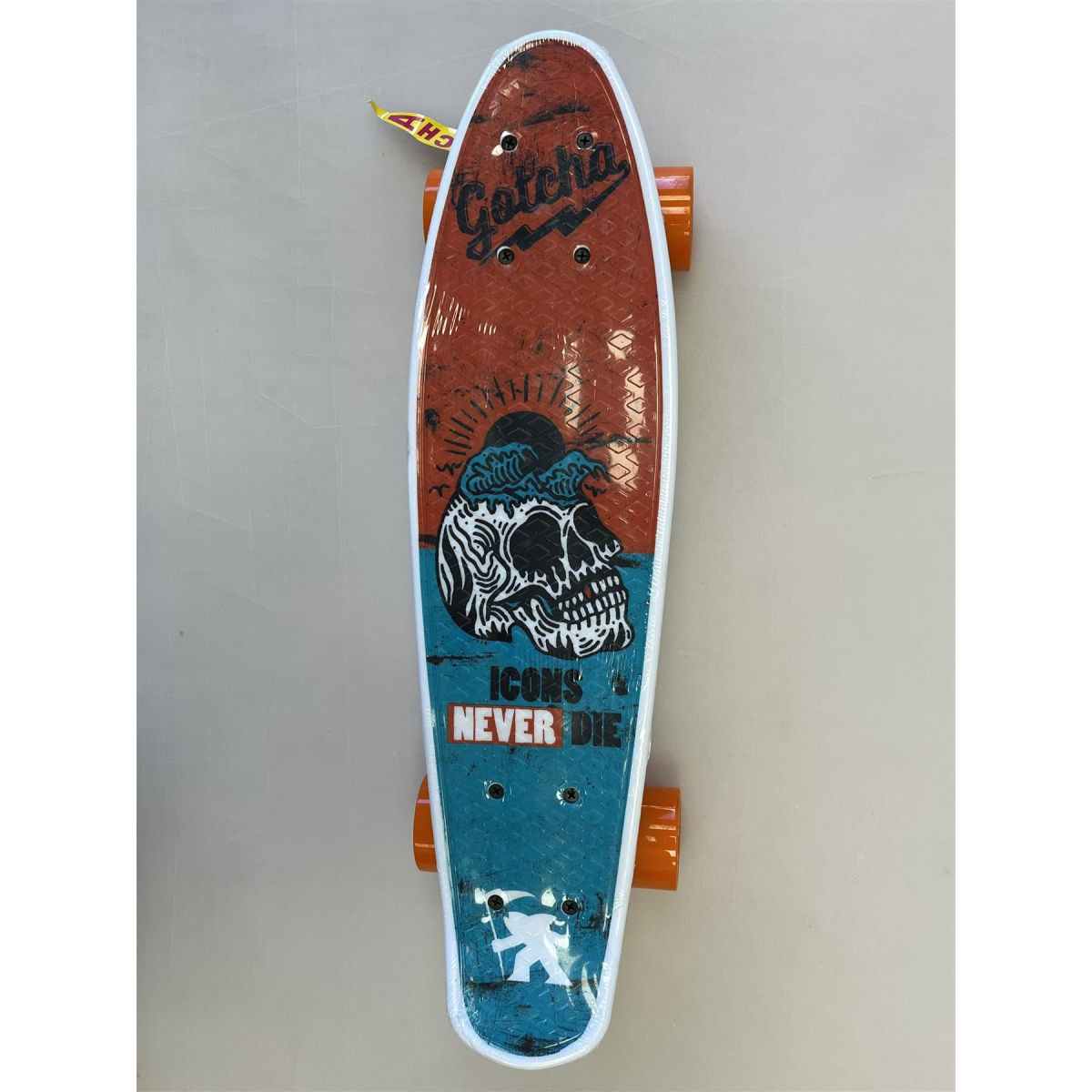 It's all about attitude REBELLIOUS. AUTHENTIC. FRESH. FUN. IRREVERENT. Gotcha has come to the epitome of the Southern California lifestyle - a chill attitude with a penchant for adventure. So relax, enjoy the sun and step into our World, a place where the crash of the Pacific combines with the beats of the city to usher you into the new, the unexpected, the authentic... Welcome to GOTCHA Gotcha Icons Never Die Complete Cruiser Skateboard Features Width: 5.75" Length: 22" Trucks: 3.5" MCD aluminium trucks Wheels: 60mm x 45mm PU Casted MCD Wheels Bearings: ABEC-7 Bearings Material PP Deck w/ Inmold Printing Design On Top With a PP deck for a strong and lightweight build, this cruiser from Gotcha features awesome artwork and a high-quality undercarriage.