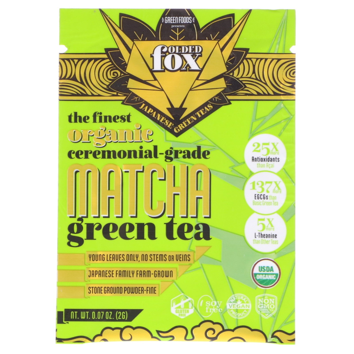 Japanese Green Teas The Finest Ceremonial-Grade Match Green Tea Young Leaves Only, No Stems or Veins Japanese Family Farm-Grown Stone Ground Powder-Fine USDA Non-GMO Certified Gluten Free Natural Vegan Product Soy Free 25x More Antioxidants than Acai 137x More EGCGs than Basic Green Tea 5x More L-Theanine than Other Teas Certified by QAI 100% ally grown and certified, Folded Fox uses only the highest quality green tea available. The result is a vivid green, fine ceremonial-grade matcha powder, lightly sweet and smooth, brimming with antioxidants, chlorophyll, catechins and l-theanine. Matcha Benefits EGCG + natural caffeine stimulate the metabolism & boost athletic performance. Antioxidants help defend against aging, inflammation & free radical damage. Chlorophyll gently detoxifies the body of toxins & balances alkalinity. L-Theanine helps to improve cognition & mood + reduces physical & mental stress.