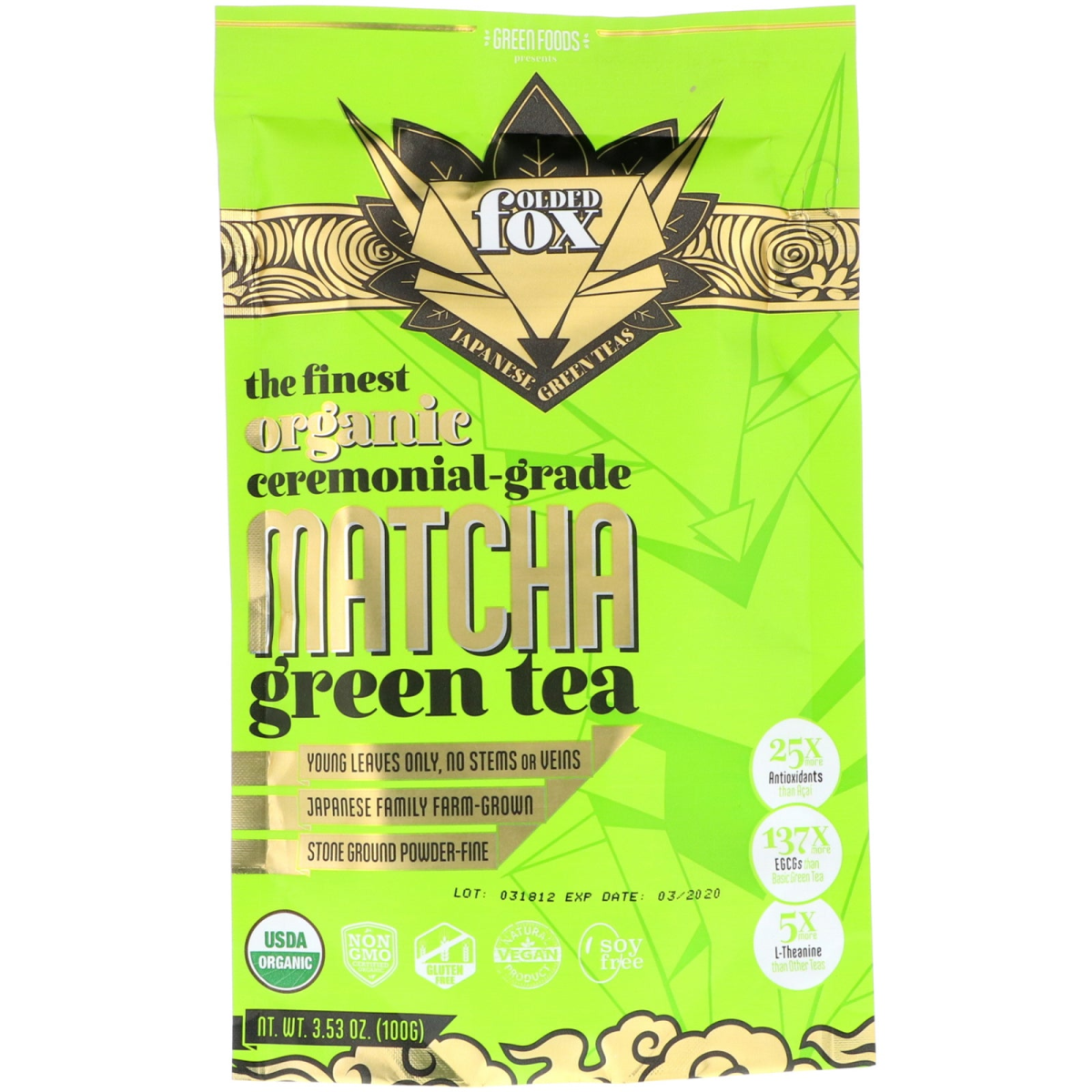 Japanese Green Teas The Finest Ceremonial-Grade Match Green Tea Young Leaves Only, No Stems or Veins Japanese Family Farm-Grown Stone Ground Powder-Fine USDA Non-GMO Certified Gluten Free Natural Vegan Product Soy Free 25x More Antioxidants than Acai 137x More EGCGs than Basic Green Tea 5x More L-Theanine than Other Teas Certified by QAI 100% ally grown and certified, Folded Fox uses only the highest quality green tea available. Traditionally grown and harvested on small family farms in Japan, multigenerational farmers carefully grow our tea with the love and expertise only time and experience can yield. They select the youngest, most supple shade-grown leaves, painstakingly remove stems and veins, then stone grind at low temperatures to optimally preserve all of the beneficial enzymes and nutrients. The result is a vivid green, fine ceremonial-grade matcha powder, lightly sweet and smooth, brimming with antioxidants, chlorophyll, catechins and l-theanine. Matcha Benefits EGCG + natural caffeine stimulate the metabolism & boost athletic performance. Antioxidants help defend against aging inflammation & free radical damage. Chlorophyll gently detoxifies the body of toxins & balances alkalinity. L-Theanine helps to improve cognition & mood plus reduces physical & mental stress.