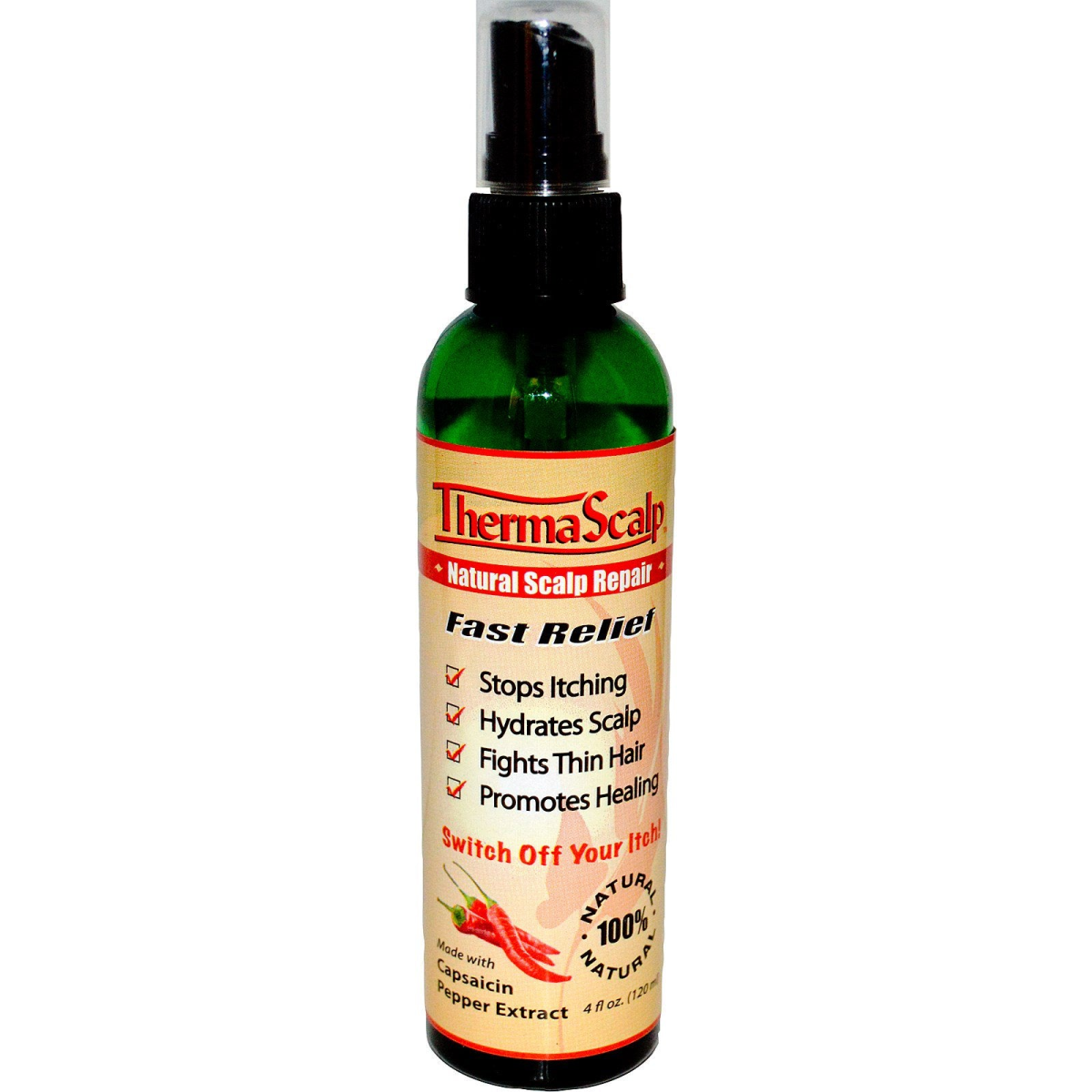 Fast Relief Stops Itching Hydrates Scalp Fights Thin Hair Promotes Healing Switch Off Your Itch! 100% natural Made with Capsaicin Pepper Extract Recommended for Men & Women All Hair Types Not Tested on Animals About ThermaScalp This formula invigorates hair follicles by creating a thermal reaction that permeates the scalp with a healing combination of proven herbal extracts. Aside from increasing absorption, the Caffeine and Capsicum in this formula also supercharge nerve endings that promote hair growth and follicle regeneration.