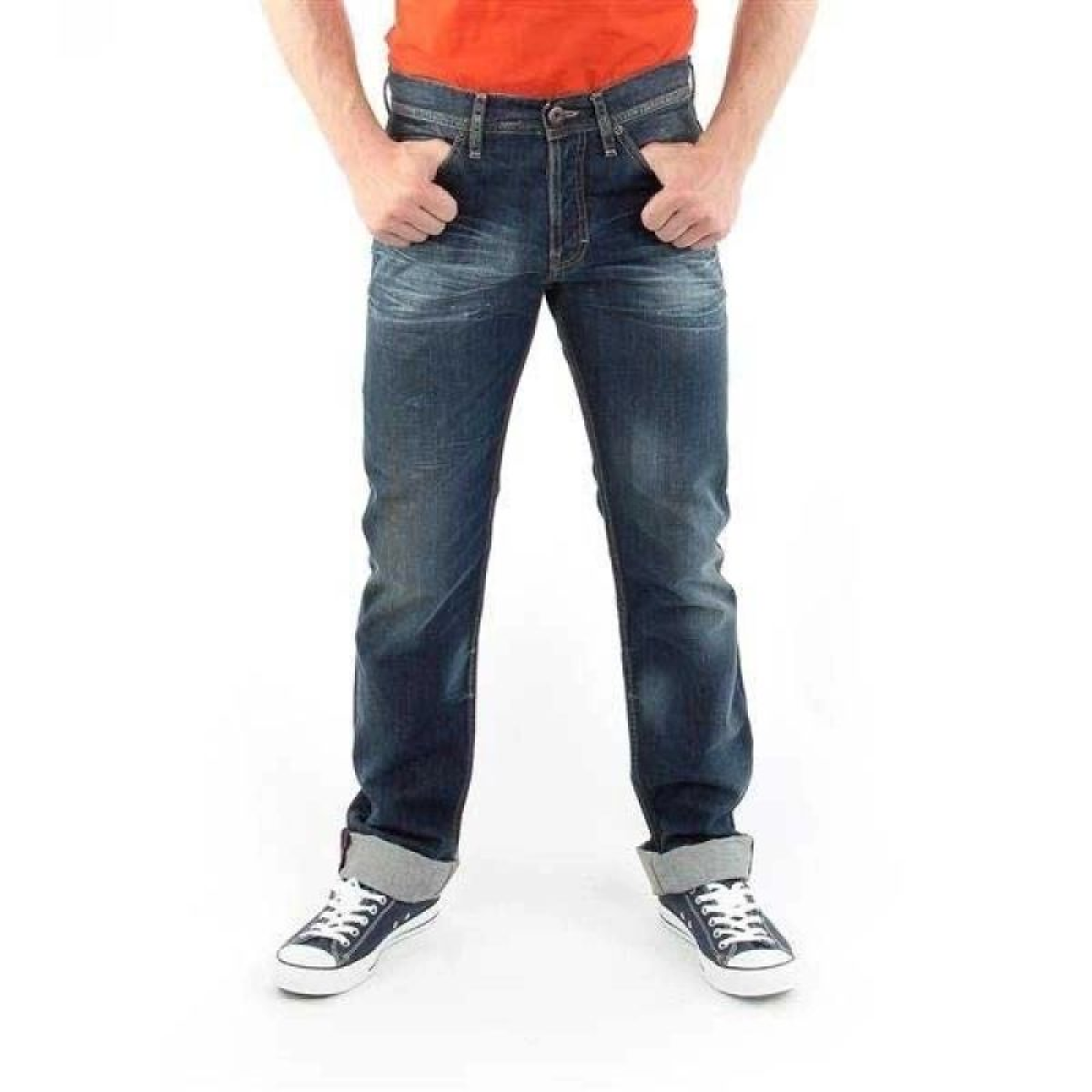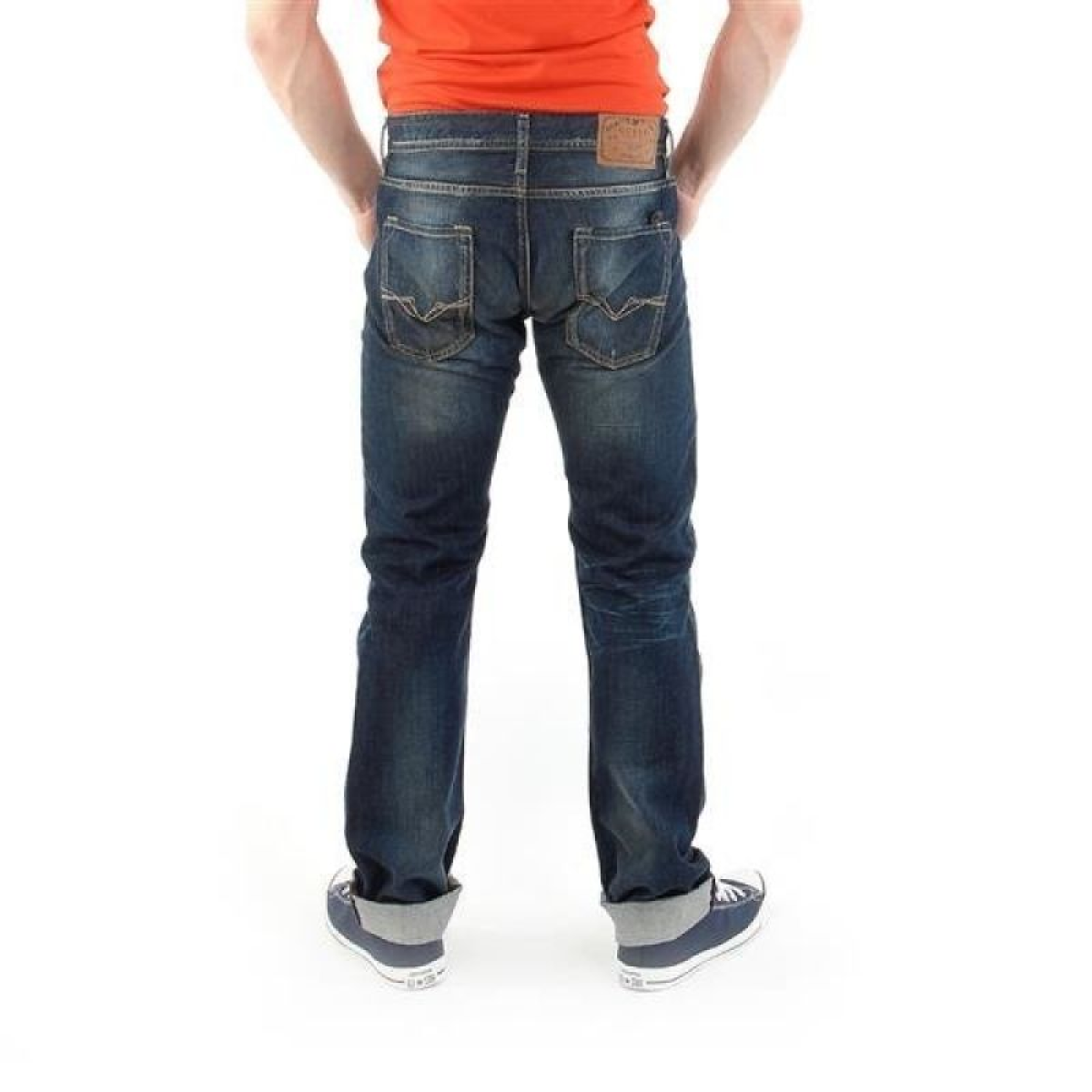 Men's straight leg jeans with button fastening.