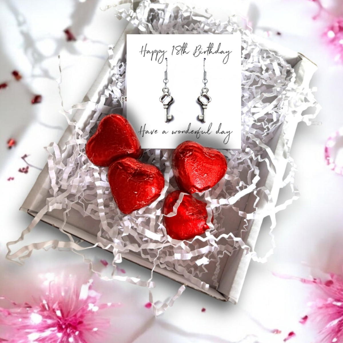 Our sweet and thoughtful 18th birthday drop earrings come with a key charm and message card with the words "Happy 18th Birthday, have a wonderful day" there's a space for you to write a little note or it can also be left blank. Additionally, the set comes with four delicious milk chocolate hearts filled with creamy caramel centre. A unique gift for a girls 18th birthday that can be treasured forever.