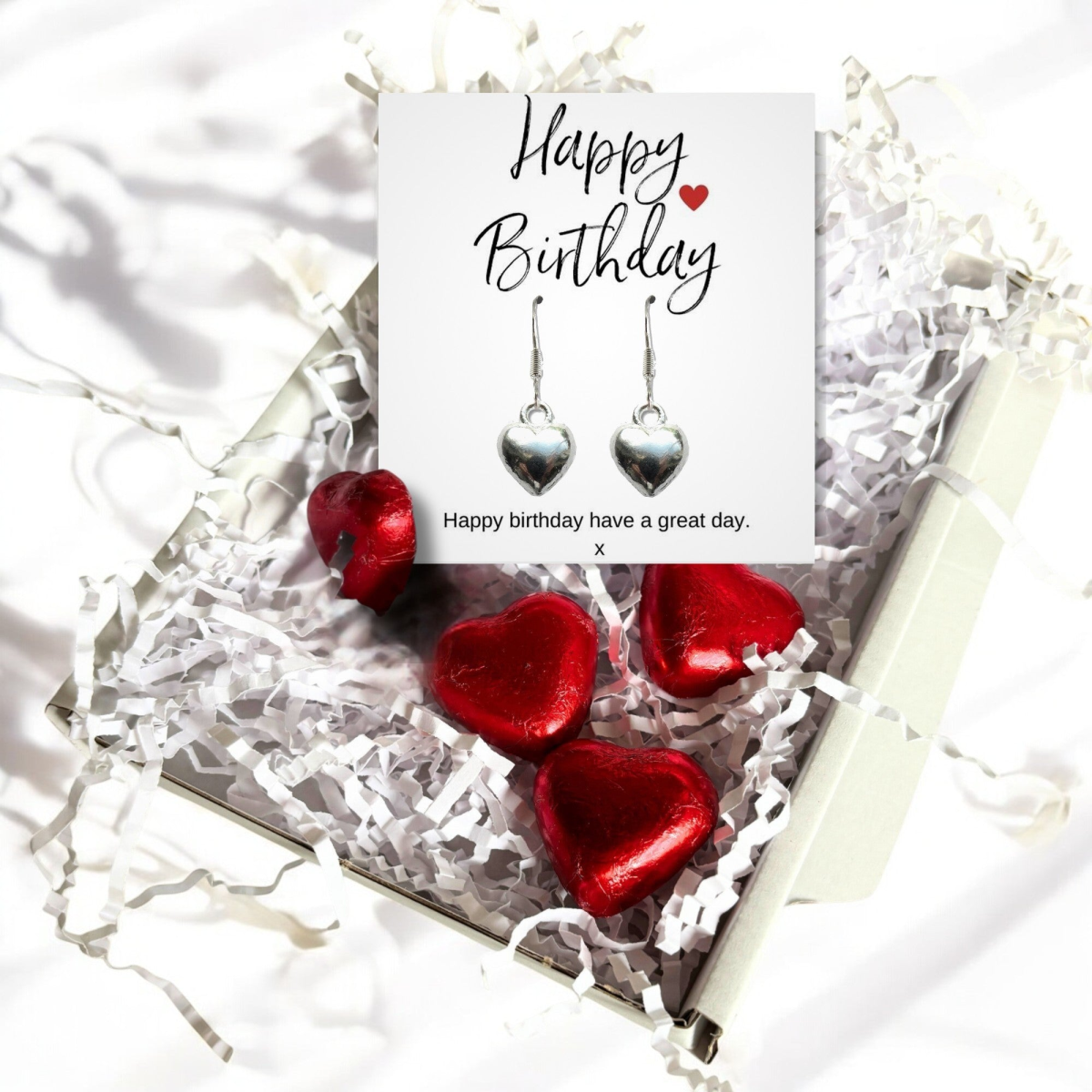 This elegant mini gift hamper includes heart-shaped silver earrings, presented on a message card with the phrase "Happy Birthday Have A Great Day x". Additionally, the set comes with four delicious milk chocolate hearts filled with creamy caramel centre. Perfect for mothers, sisters, daughters, aunts, or grandmothers, this delightful gift offers a small section for a personal note or the choice to keep it blank.