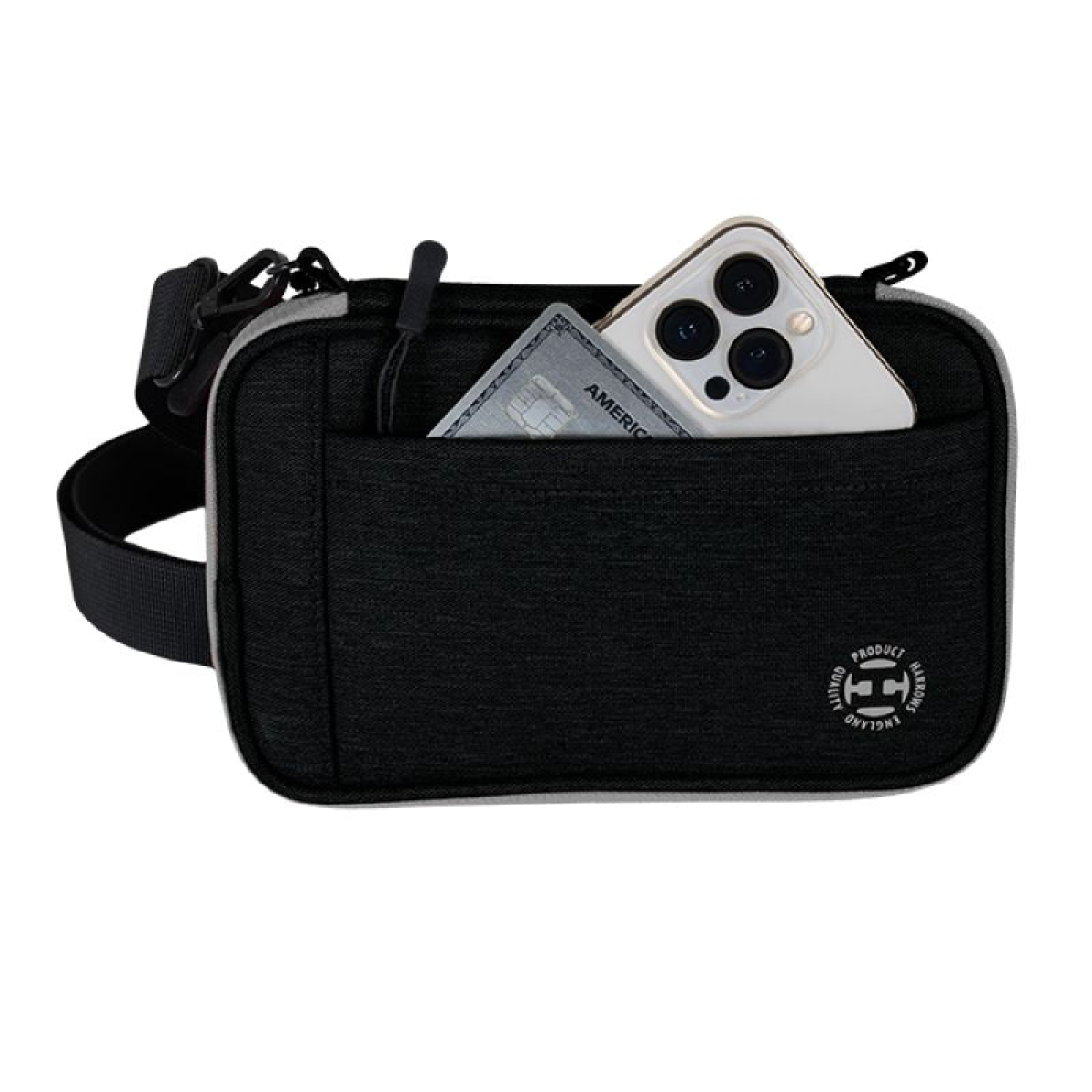 Additional external zippered compartment that's large enough to fit a phone, wallet or keys.