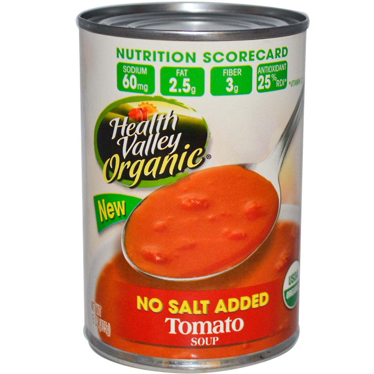 New USDA Certified by Quality Assurance International (QAI) Nutrition Scorecard Sodium 60 mg Fat 2.5 g Fiber 3 g Antioxidant 25% RDI* *Vitamin C Our Tomato Soup is made with the finest ingredients and has No Salt Added. It is also an excellent source of antioxidant vitamin C (25%) and a good source of fiber (3 g). This Health Valley soup contains 60 milligrams sodium per serving. Other leading brands contain 710 milligrams sodium or more per serving.