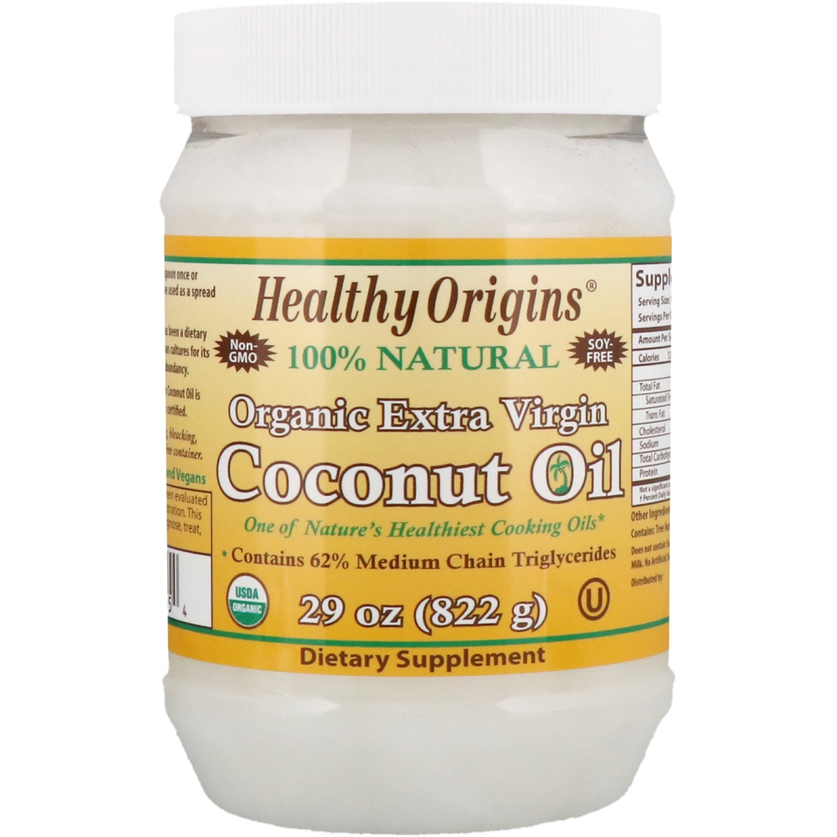 Non-GMO 100% Natural Soy-Free One of Nature's Healthiest Cooking Oils Contains 62% Medium Chain Triglycerides USDA Dietary Supplement Certified by Pro-Cert Certified Kosher by Orthodox Union Suitable for Vegetarians and Vegans For many generations, coconut oil has been a dietary staple in African, Asian and Polynesian cultures for its fatty acid content, great taste and abundancy. Healthy Origins Extra Virgin Coconut Oil is cold-pressed 100% pure, and kosher certified.